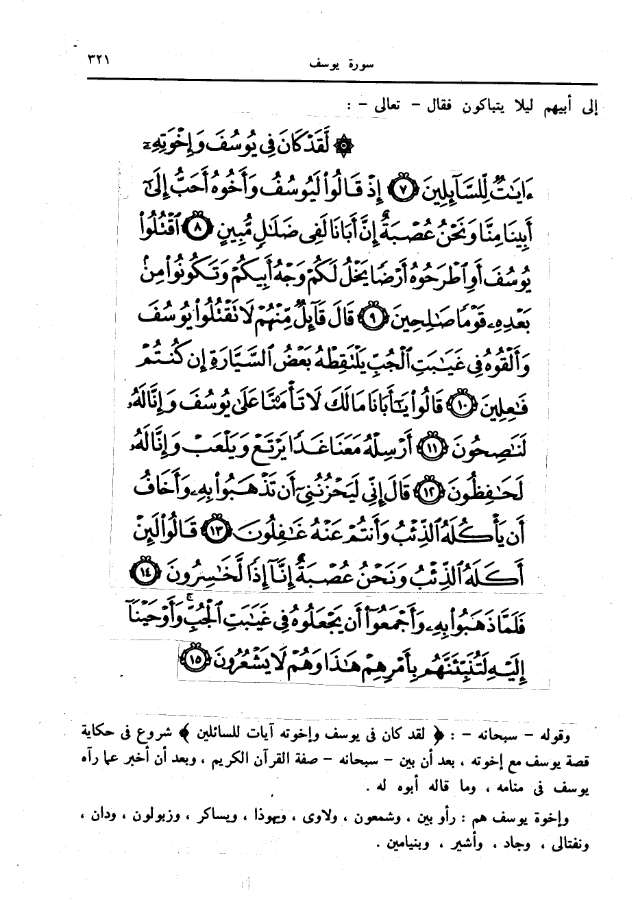 لَقَدْ كانَ فِي يُوسُفَ وَإِخْوَتِهِ آياتٌ لِلسَّائِلِينَ (7) إِذْ قالُوا لَيُوسُفُ وَأَخُوهُ أَحَبُّ إِلى أَبِينا مِنَّا وَنَحْنُ عُصْبَةٌ إِنَّ أَبانا لَفِي ضَلالٍ مُبِينٍ (8) اقْتُلُوا يُوسُفَ أَوِ اطْرَحُوهُ أَرْضاً يَخْلُ لَكُمْ وَجْهُ أَبِيكُمْ وَتَكُونُوا مِنْ بَعْدِهِ قَوْماً صالِحِينَ (9) قالَ قائِلٌ مِنْهُمْ لا تَقْتُلُوا يُوسُفَ وَأَلْقُوهُ فِي غَيابَتِ الْجُبِّ يَلْتَقِطْهُ بَعْضُ السَّيَّارَةِ إِنْ كُنْتُمْ فاعِلِينَ (10) قالُوا يا أَبانا ما لَكَ لا تَأْمَنَّا عَلى يُوسُفَ وَإِنَّا لَهُ لَناصِحُونَ (11)