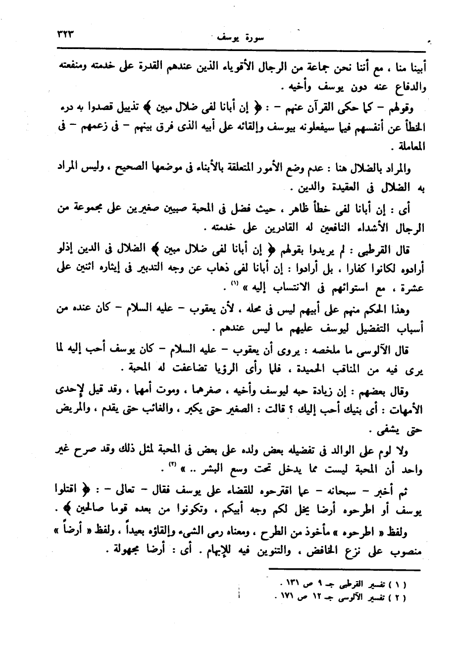 قال القرطبي: لم يريدوا بقولهم إِنَّ أَبانا لَفِي ضَلالٍ مُبِينٍ الضلال في الدين إذ لو أرادوه لكانوا كفارا، بل أرادوا: إن أبانا لفي ذهاب عن وجه التدبير في إيثاره اثنين على عشرة، مع استوائهم في الانتساب إليه» «1» .