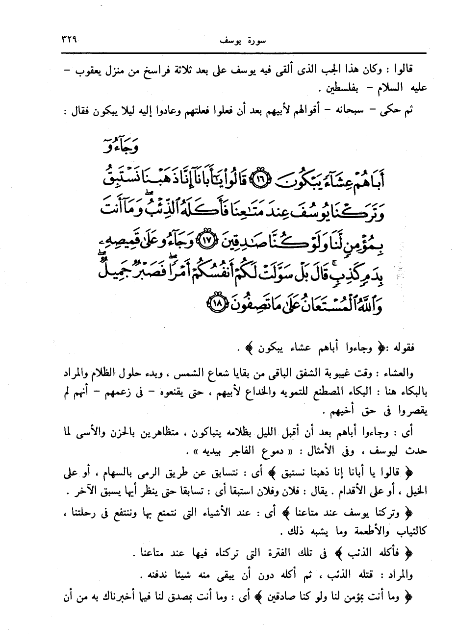 وَجاؤُ أَباهُمْ عِشاءً يَبْكُونَ (16) قالُوا يا أَبانا إِنَّا ذَهَبْنا نَسْتَبِقُ وَتَرَكْنا يُوسُفَ عِنْدَ مَتاعِنا فَأَكَلَهُ الذِّئْبُ وَما أَنْتَ بِمُؤْمِنٍ لَنا وَلَوْ كُنَّا صادِقِينَ (17) وَجاؤُ عَلى قَمِيصِهِ بِدَمٍ كَذِبٍ قالَ بَلْ سَوَّلَتْ لَكُمْ أَنْفُسُكُمْ أَمْراً فَصَبْرٌ جَمِيلٌ وَاللَّهُ الْمُسْتَعانُ عَلى ما تَصِفُونَ (18)