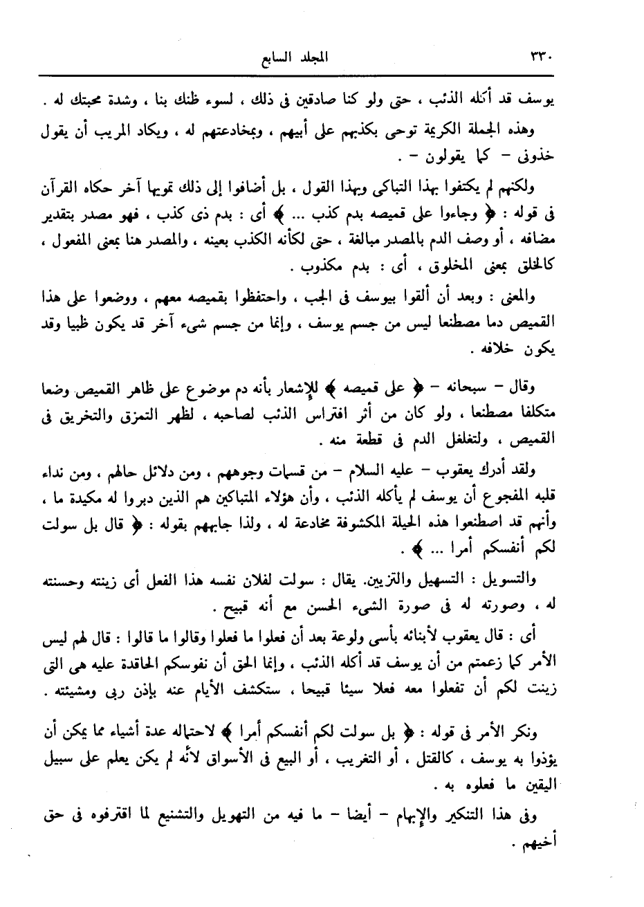 ولقد أدرك يعقوب- عليه السلام- من قسمات وجوههم، ومن دلائل حالهم، ومن نداء قلبه المفجوع أن يوسف لم يأكله الذئب، وأن هؤلاء المتباكين هم الذين دبروا له مكيدة ما، وأنهم قد اصطنعوا هذه الحيلة المكشوفة مخادعة له، ولذا جابههم بقوله: قالَ بَلْ سَوَّلَتْ لَكُمْ أَنْفُسُكُمْ أَمْراً....
