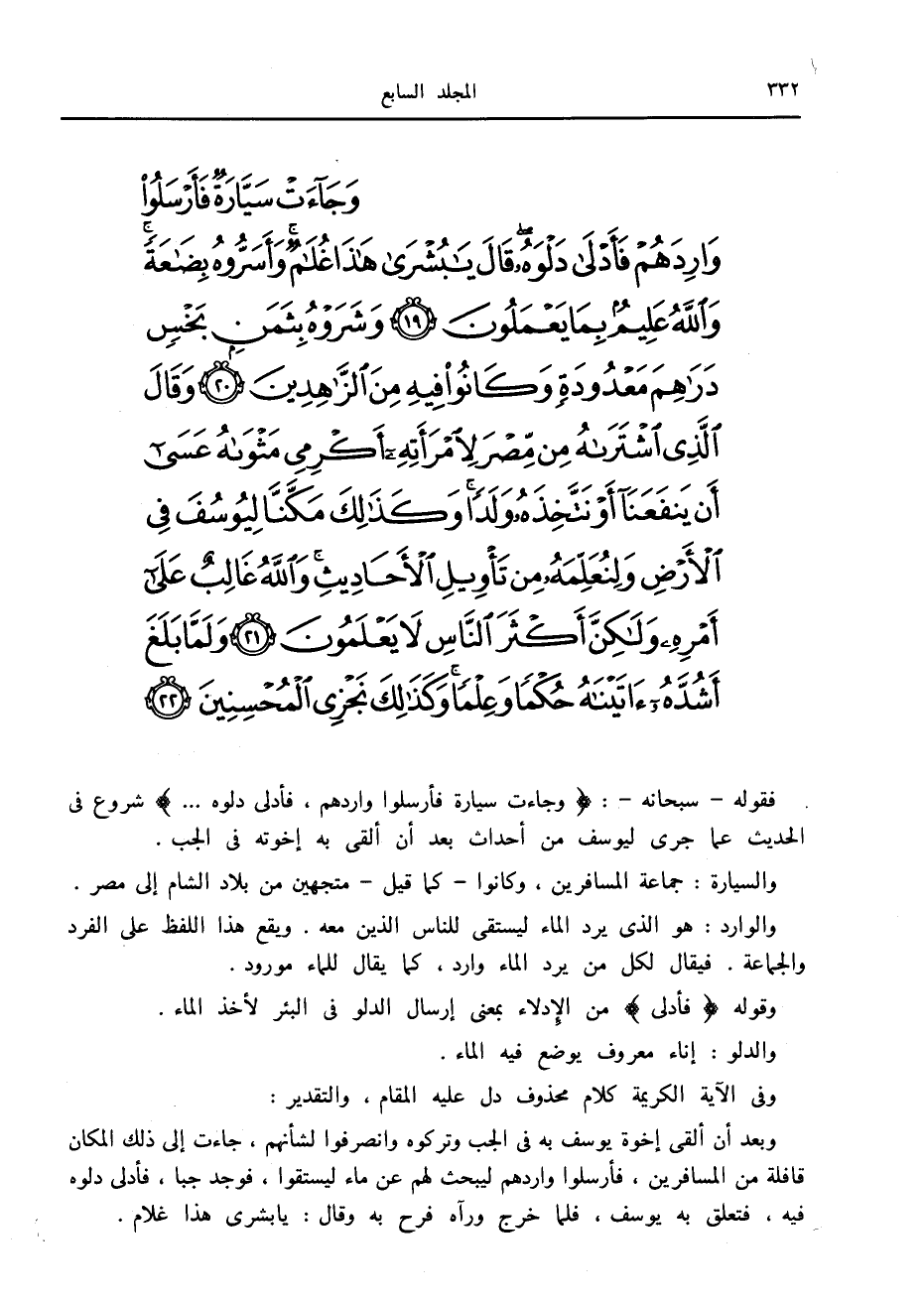 وَجاءَتْ سَيَّارَةٌ فَأَرْسَلُوا وارِدَهُمْ فَأَدْلى دَلْوَهُ قالَ يا بُشْرى هذا غُلامٌ وَأَسَرُّوهُ بِضاعَةً وَاللَّهُ عَلِيمٌ بِما يَعْمَلُونَ (19) وَشَرَوْهُ بِثَمَنٍ بَخْسٍ دَراهِمَ مَعْدُودَةٍ وَكانُوا فِيهِ مِنَ الزَّاهِدِينَ (20) وَقالَ الَّذِي اشْتَراهُ مِنْ مِصْرَ لامْرَأَتِهِ أَكْرِمِي مَثْواهُ عَسى أَنْ يَنْفَعَنا أَوْ نَتَّخِذَهُ وَلَداً وَكَذلِكَ مَكَّنَّا لِيُوسُفَ فِي الْأَرْضِ وَلِنُعَلِّمَهُ مِنْ تَأْوِيلِ الْأَحادِيثِ وَاللَّهُ غالِبٌ عَلى أَمْرِهِ وَلكِنَّ أَكْثَرَ النَّاسِ لا يَعْلَمُونَ (21) وَلَمَّا بَلَغَ أَشُدَّهُ آتَيْناهُ حُكْماً وَعِلْماً وَكَذلِكَ نَجْزِي الْمُحْسِنِينَ (22)