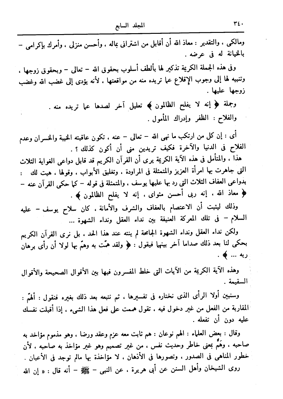 بدواعى العفاف الثلاث التي رد بها عليها يوسف، والمتمثلة في قوله- كما حكى القرآن عنه- مَعاذَ اللَّهِ، إِنَّهُ رَبِّي أَحْسَنَ مَثْوايَ، إِنَّهُ لا يُفْلِحُ الظَّالِمُونَ.