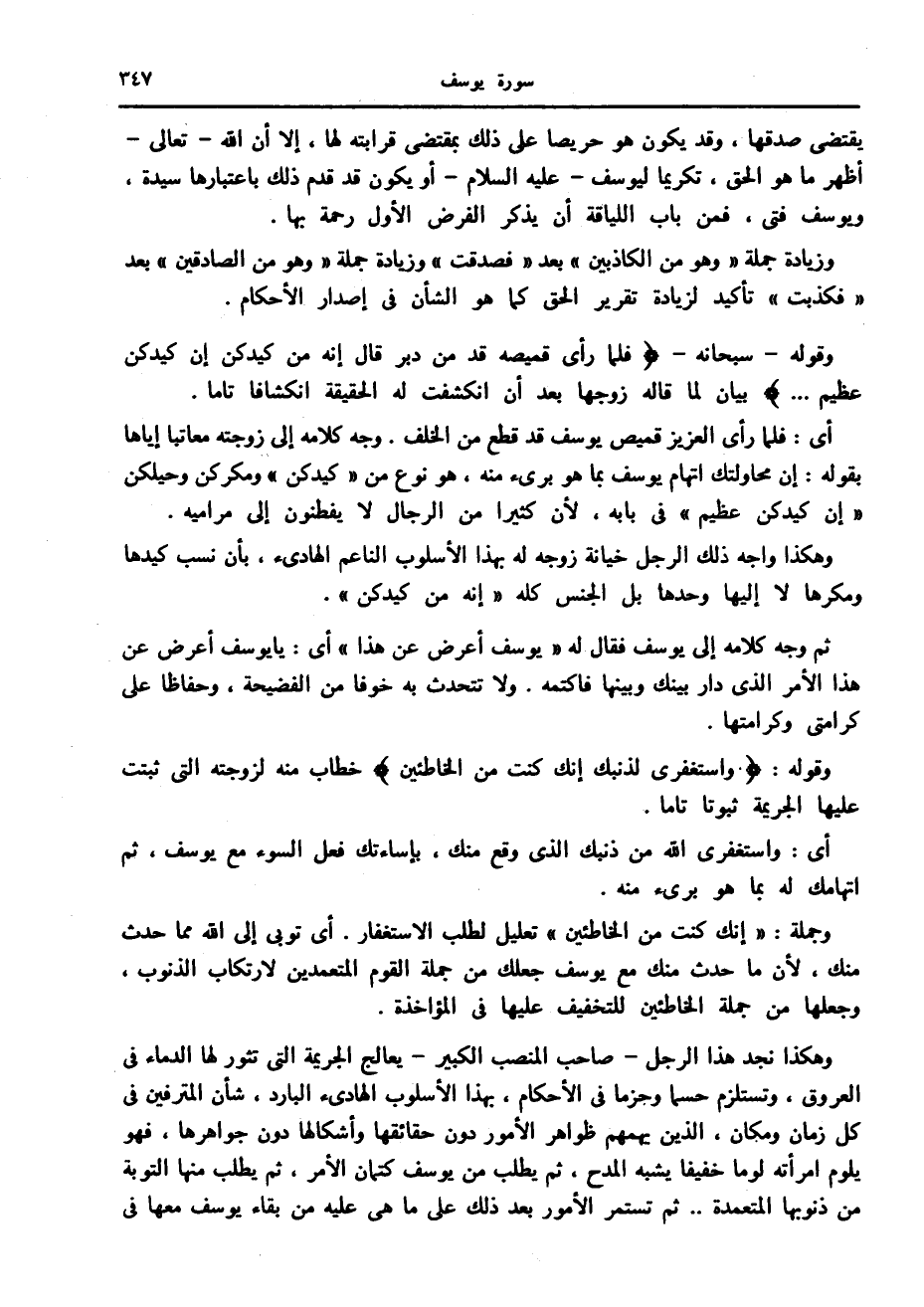 وهكذا نجد هذا الرجل- صاحب المنصب الكبير- يعالج الجريمة التي تثور لها الدماء في العروق، وتستلزم حسما وحزما في الأحكام، بهذا الأسلوب الهادئ البارد، شأن المترفين في كل زمان ومكان، الذين يهمهم ظواهر الأمور دون حقائقها وأشكالها دون جواهرها، فهو يلوم امرأته لوما خفيفا يشبه المدح، ثم يطلب من يوسف كتمان الأمر، ثم يطلب منها التوبة من ذنوبها المتعمدة.. ثم تستمر الأمور بعد ذلك على ما هي عليه من بقاء يوسف معها في