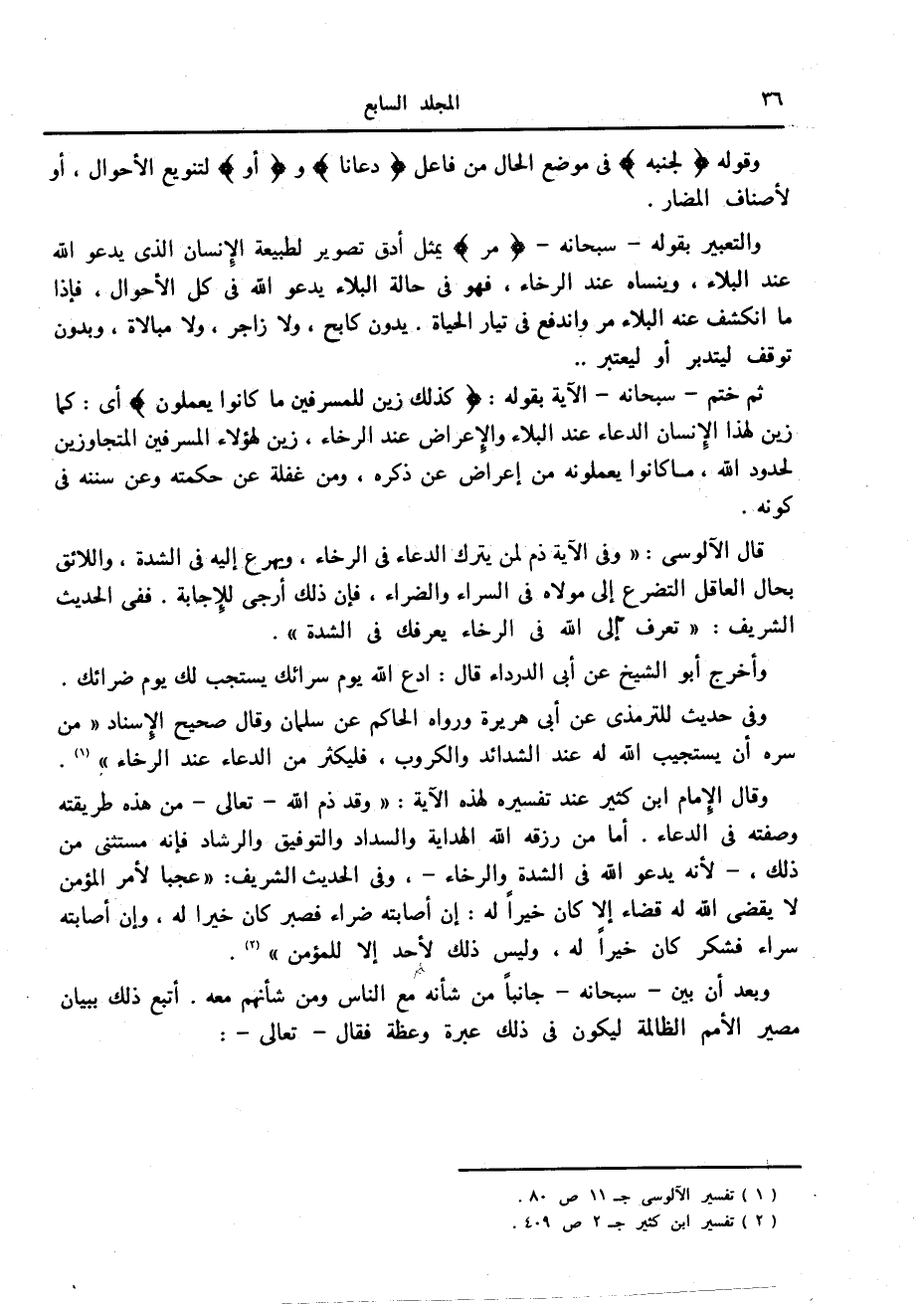 وقال الإمام ابن كثير عند تفسيره لهذه الآية: «وقد ذم الله- تعالى- من هذه طريقته وصفته في الدعاء. أما من رزقه الله الهداية والسداد والتوفيق والرشاد فإنه مستثنى من ذلك، - لأنه يدعو الله في الشدة والرخاء-، وفي الحديث الشريف: «عجبا لأمر المؤمن لا يقضى الله له قضاء إلا كان خيرا له: إن أصابته ضراء فصبر كان خيرا له، وإن أصابته سراء فشكر كان خيرا له، وليس ذلك لأحد إلا للمؤمن» «2» .