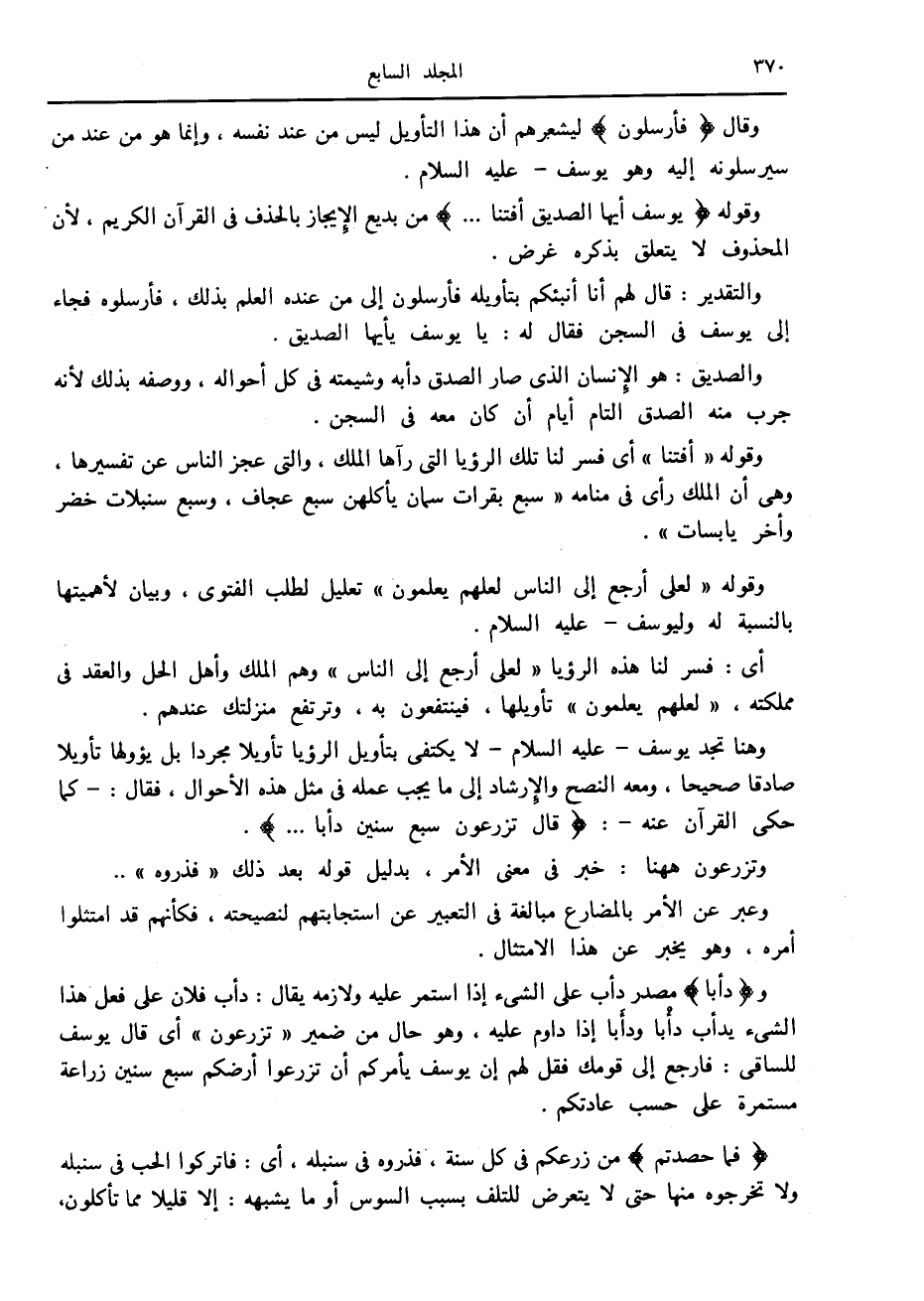 وهنا تجد يوسف- عليه السلام- لا يكتفى بتأويل الرؤيا تأويلا مجردا بل يؤولها تأويلا صادقا صحيحا، ومعه النصح والإرشاد إلى ما يجب عمله في مثل هذه الأحوال، فقال: - كما حكى القرآن عنه-: قالَ تَزْرَعُونَ سَبْعَ سِنِينَ دَأَباً....