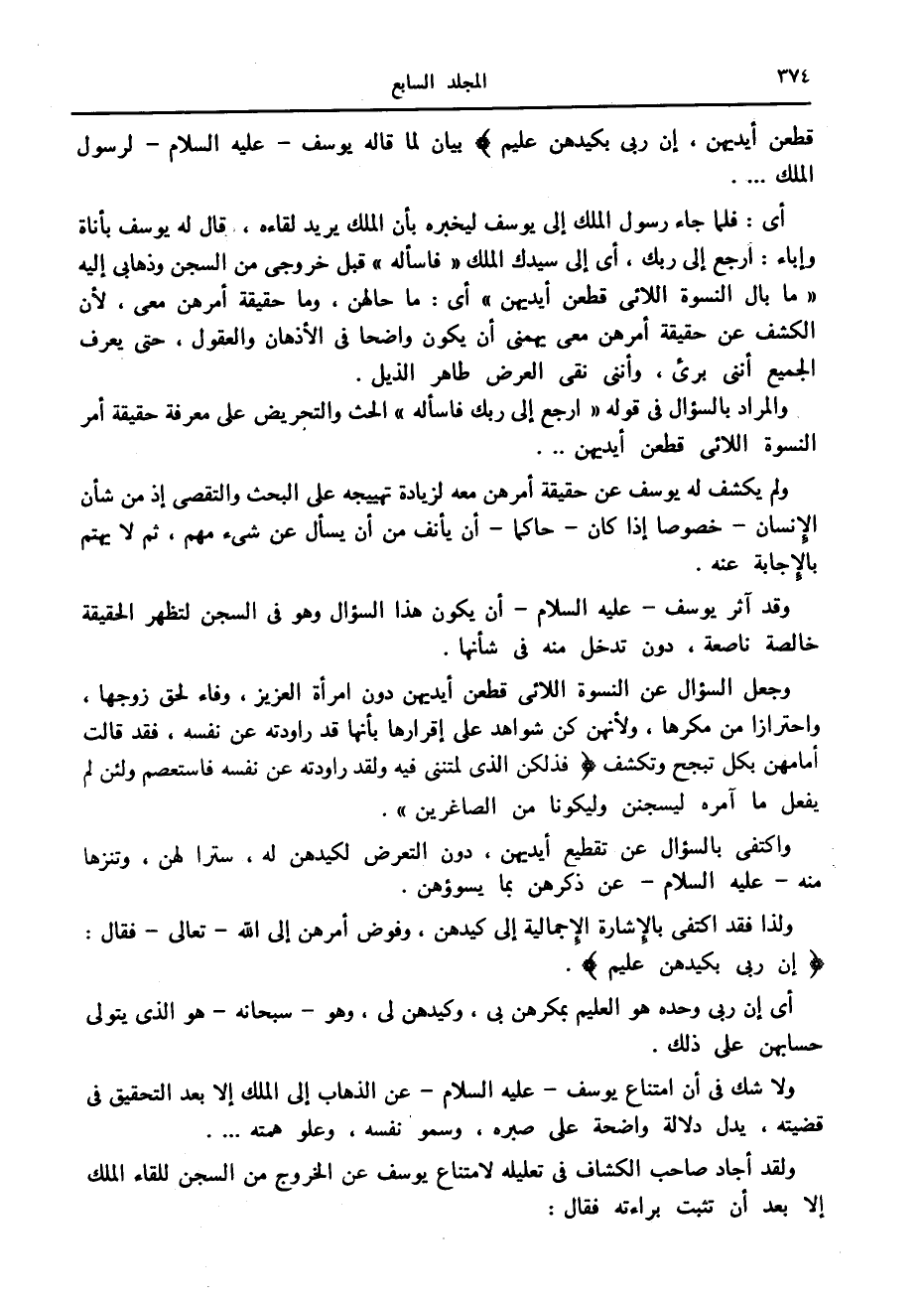 والمراد بالسؤال في قوله «ارجع إلى ربك فاسأله» الحث والتحريض على معرفة حقيقة أمر النسوة اللائي قطعن أيديهن ...