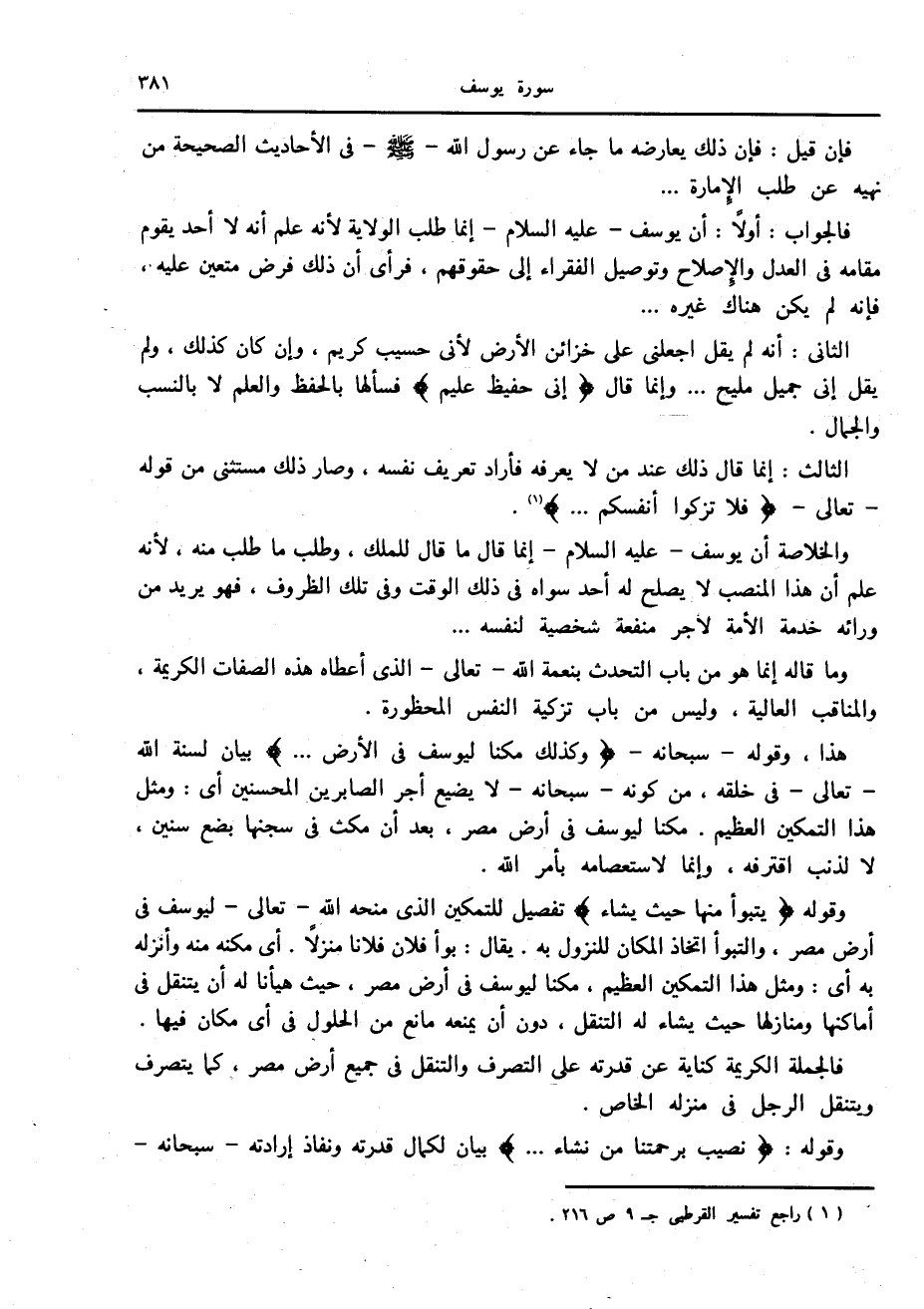 فالجواب: أولا: أن يوسف- عليه السلام- إنما طلب الولاية لأنه علم أنه لا أحد يقوم مقامه في العدل والإصلاح وتوصيل الفقراء إلى حقوقهم، فرأى أن ذلك فرض متعين عليه، فإنه لم يكن هناك غيره ...