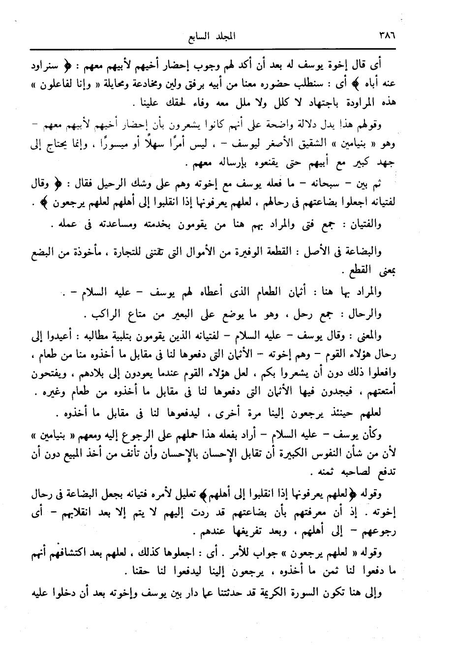 وكأن يوسف- عليه السلام- أراد بفعله هذا حملهم على الرجوع إليه ومعهم «بنيامين» لأن من شأن النفوس الكبيرة أن تقابل الإحسان بالإحسان وأن تأنف من أخذ المبيع دون أن تدفع لصاحبه ثمنه.