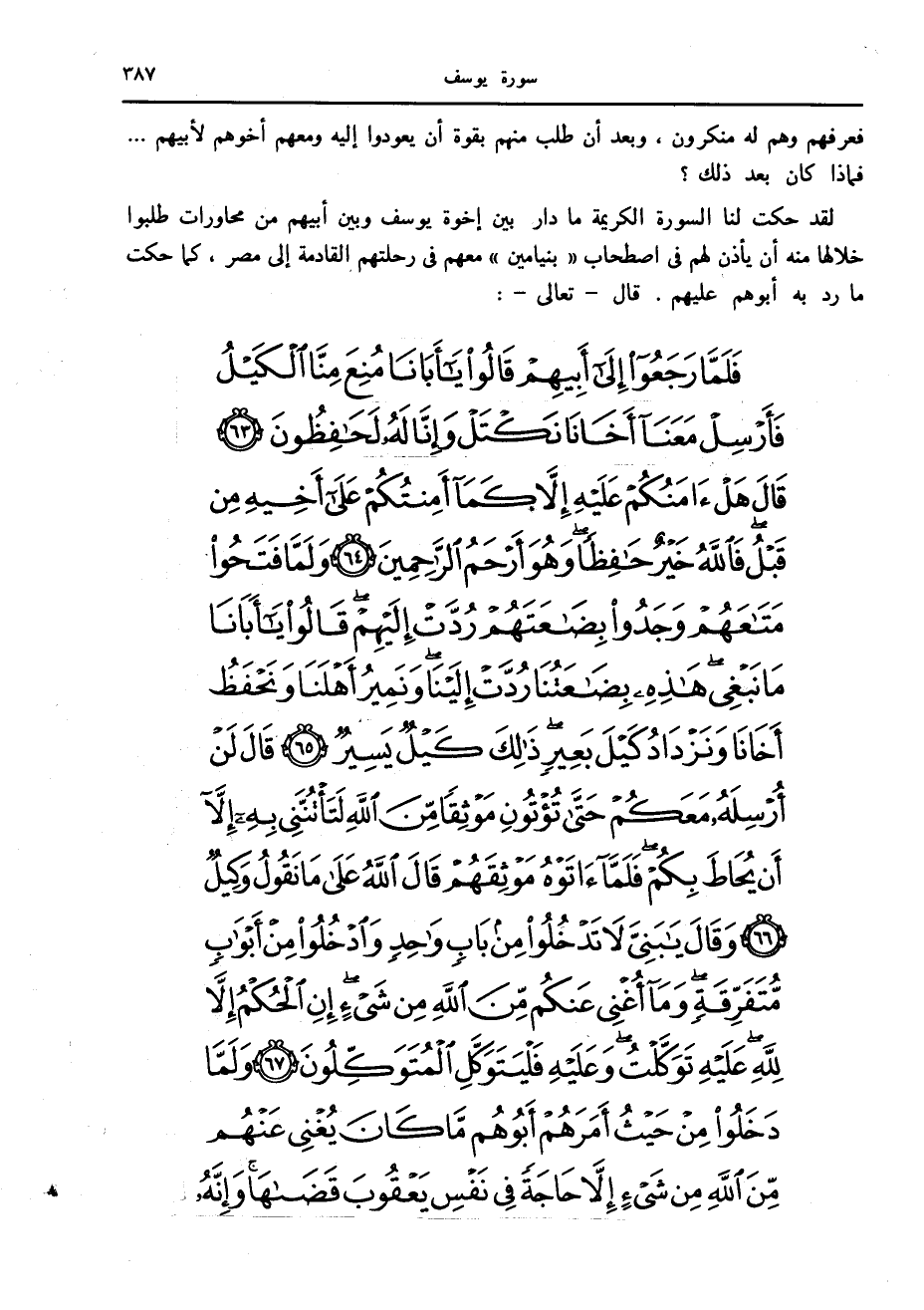 فَلَمَّا رَجَعُوا إِلى أَبِيهِمْ قالُوا يا أَبانا مُنِعَ مِنَّا الْكَيْلُ فَأَرْسِلْ مَعَنا أَخانا نَكْتَلْ وَإِنَّا لَهُ لَحافِظُونَ (63) قالَ هَلْ آمَنُكُمْ عَلَيْهِ إِلاَّ كَما أَمِنْتُكُمْ عَلى أَخِيهِ مِنْ قَبْلُ فَاللَّهُ خَيْرٌ حافِظاً وَهُوَ أَرْحَمُ الرَّاحِمِينَ (64) وَلَمَّا فَتَحُوا مَتاعَهُمْ وَجَدُوا بِضاعَتَهُمْ رُدَّتْ إِلَيْهِمْ قالُوا يا أَبانا ما نَبْغِي هذِهِ بِضاعَتُنا رُدَّتْ إِلَيْنا وَنَمِيرُ أَهْلَنا وَنَحْفَظُ أَخانا وَنَزْدادُ كَيْلَ بَعِيرٍ ذلِكَ كَيْلٌ يَسِيرٌ (65) قالَ لَنْ أُرْسِلَهُ مَعَكُمْ حَتَّى تُؤْتُونِ مَوْثِقاً مِنَ اللَّهِ لَتَأْتُنَّنِي بِهِ إِلاَّ أَنْ يُحاطَ بِكُمْ فَلَمَّا آتَوْهُ مَوْثِقَهُمْ قالَ اللَّهُ عَلى ما نَقُولُ وَكِيلٌ (66) وَقالَ يا بَنِيَّ لا تَدْخُلُوا مِنْ بابٍ واحِدٍ وَادْخُلُوا مِنْ أَبْوابٍ مُتَفَرِّقَةٍ وَما أُغْنِي عَنْكُمْ مِنَ اللَّهِ مِنْ شَيْءٍ إِنِ الْحُكْمُ إِلاَّ لِلَّهِ عَلَيْهِ تَوَكَّلْتُ وَعَلَيْهِ فَلْيَتَوَكَّلِ الْمُتَوَكِّلُونَ (67)
