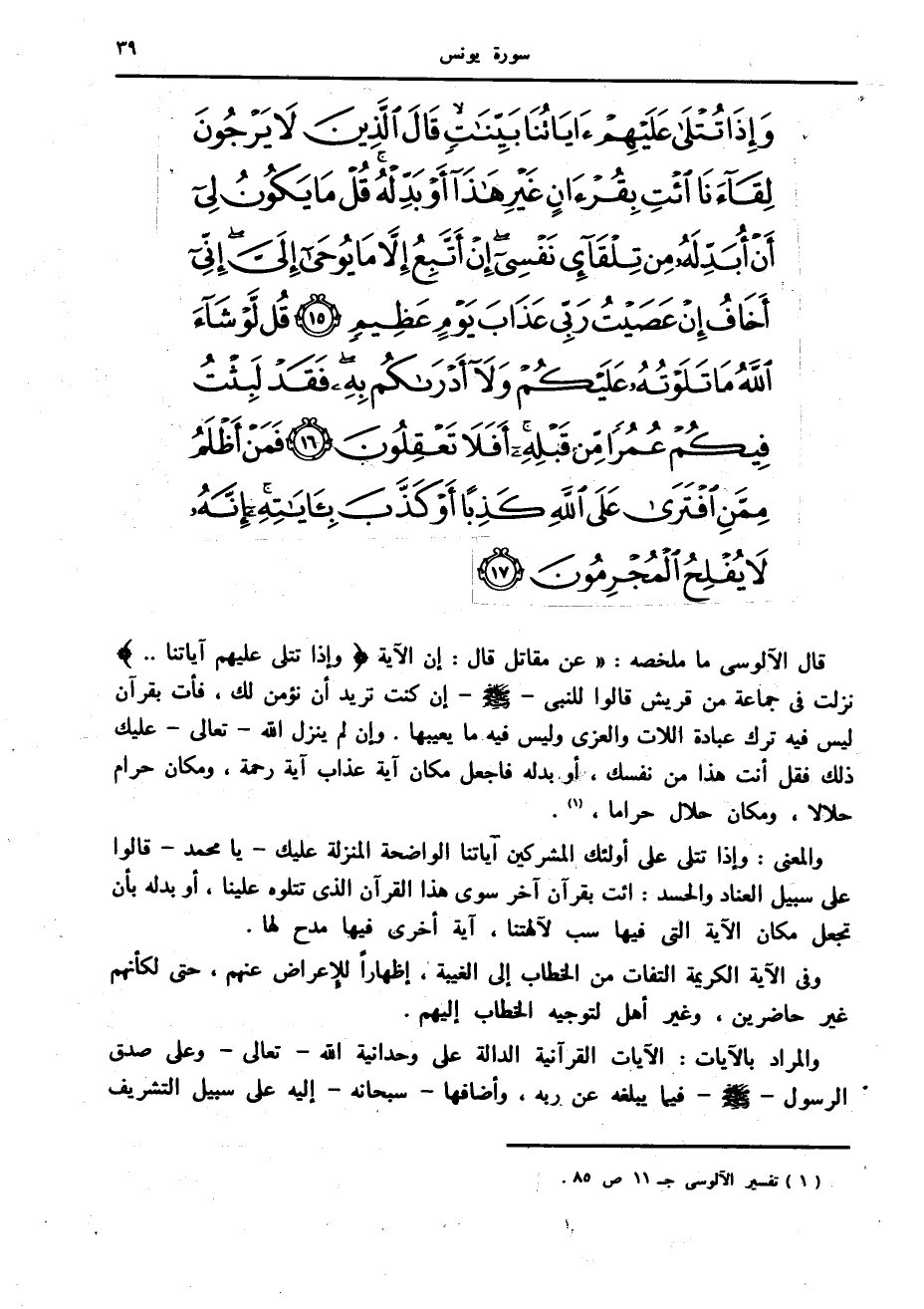 وَإِذا تُتْلى عَلَيْهِمْ آياتُنا بَيِّناتٍ قالَ الَّذِينَ لا يَرْجُونَ لِقاءَنَا ائْتِ بِقُرْآنٍ غَيْرِ هذا أَوْ بَدِّلْهُ قُلْ ما يَكُونُ لِي أَنْ أُبَدِّلَهُ مِنْ تِلْقاءِ نَفْسِي إِنْ أَتَّبِعُ إِلاَّ ما يُوحى إِلَيَّ إِنِّي أَخافُ إِنْ عَصَيْتُ رَبِّي عَذابَ يَوْمٍ عَظِيمٍ (15) قُلْ لَوْ شاءَ اللَّهُ ما تَلَوْتُهُ عَلَيْكُمْ وَلا أَدْراكُمْ بِهِ فَقَدْ لَبِثْتُ فِيكُمْ عُمُراً مِنْ قَبْلِهِ أَفَلا تَعْقِلُونَ (16) فَمَنْ أَظْلَمُ مِمَّنِ افْتَرى عَلَى اللَّهِ كَذِباً أَوْ كَذَّبَ بِآياتِهِ إِنَّهُ لا يُفْلِحُ الْمُجْرِمُونَ (17)