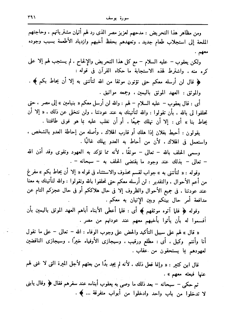 وقوله: «لتأتننى به» جواب لقسم محذوف والاستثناء في قوله «إلا أن يحاط بكم» مفرغ من أعم الأحوال، والتقدير: لن أرسله معكم حتى تحلفوا بالله وتقولوا: والله لنأتينك به معنا عند عودتنا، في جميع الأحوال والظروف إلا في حال هلاككم أو في حال عجزكم التام عن مدافعة أمر حال بينكم وبين الإتيان به معكم.