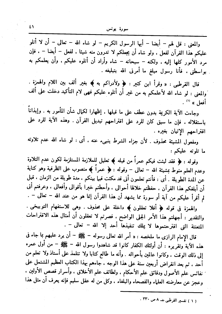 وقوله: فَقَدْ لَبِثْتُ فِيكُمْ عُمُراً مِنْ قَبْلِهِ تعليل للملازمة المستلزمة لكون عدم التلاوة وعدم العلم منوط بمشيئة الله- تعالى- وقوله: عُمُراً منصوب على الظرفية وهو كناية عن المدة الطويلة. أى: فأنتم تعلمون أنى قد مكثت فيما بينكم، مدة طويلة من الزمان، قبل أن أبلغكم هذا القرآن، حفظتم خلالها أحوالى، وأحطتم خبرا بأقوالى وأفعالى، وعرفتم أنى لم أقرأ عليكم من آية أو سورة مما يشهد أن هذا القرآن إنما هو من عند الله- تعالى-.