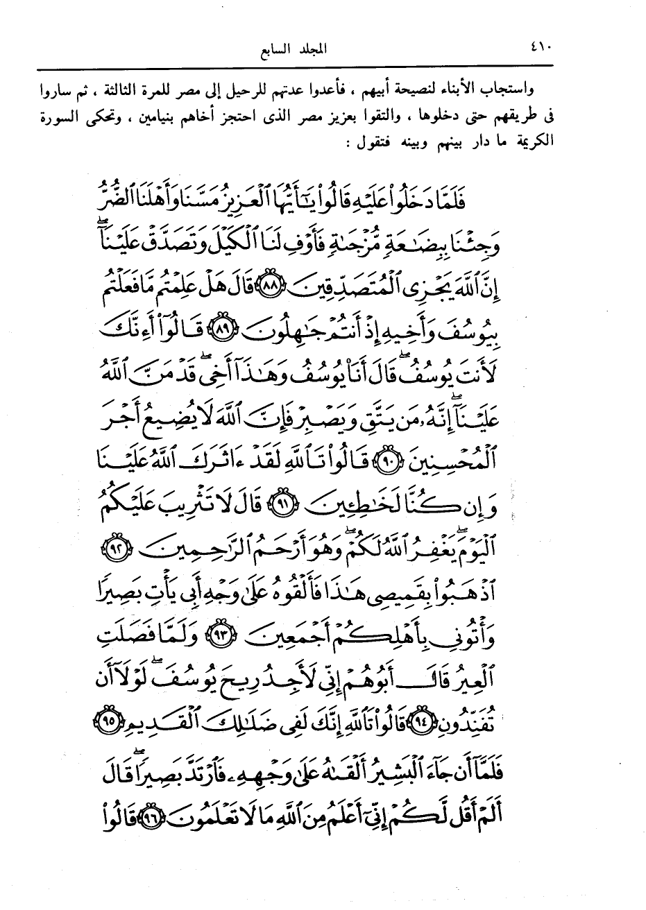 فَلَمَّا دَخَلُوا عَلَيْهِ قالُوا يا أَيُّهَا الْعَزِيزُ مَسَّنا وَأَهْلَنَا الضُّرُّ وَجِئْنا بِبِضاعَةٍ مُزْجاةٍ فَأَوْفِ لَنَا الْكَيْلَ وَتَصَدَّقْ عَلَيْنا إِنَّ اللَّهَ يَجْزِي الْمُتَصَدِّقِينَ (88) قالَ هَلْ عَلِمْتُمْ ما فَعَلْتُمْ بِيُوسُفَ وَأَخِيهِ إِذْ أَنْتُمْ جاهِلُونَ (89) قالُوا أَإِنَّكَ لَأَنْتَ يُوسُفُ قالَ أَنَا يُوسُفُ وَهذا أَخِي قَدْ مَنَّ اللَّهُ عَلَيْنا إِنَّهُ مَنْ يَتَّقِ وَيَصْبِرْ فَإِنَّ اللَّهَ لا يُضِيعُ أَجْرَ الْمُحْسِنِينَ (90) قالُوا تَاللَّهِ لَقَدْ آثَرَكَ اللَّهُ عَلَيْنا وَإِنْ كُنَّا لَخاطِئِينَ (91) قالَ لا تَثْرِيبَ عَلَيْكُمُ الْيَوْمَ يَغْفِرُ اللَّهُ لَكُمْ وَهُوَ أَرْحَمُ الرَّاحِمِينَ (92)