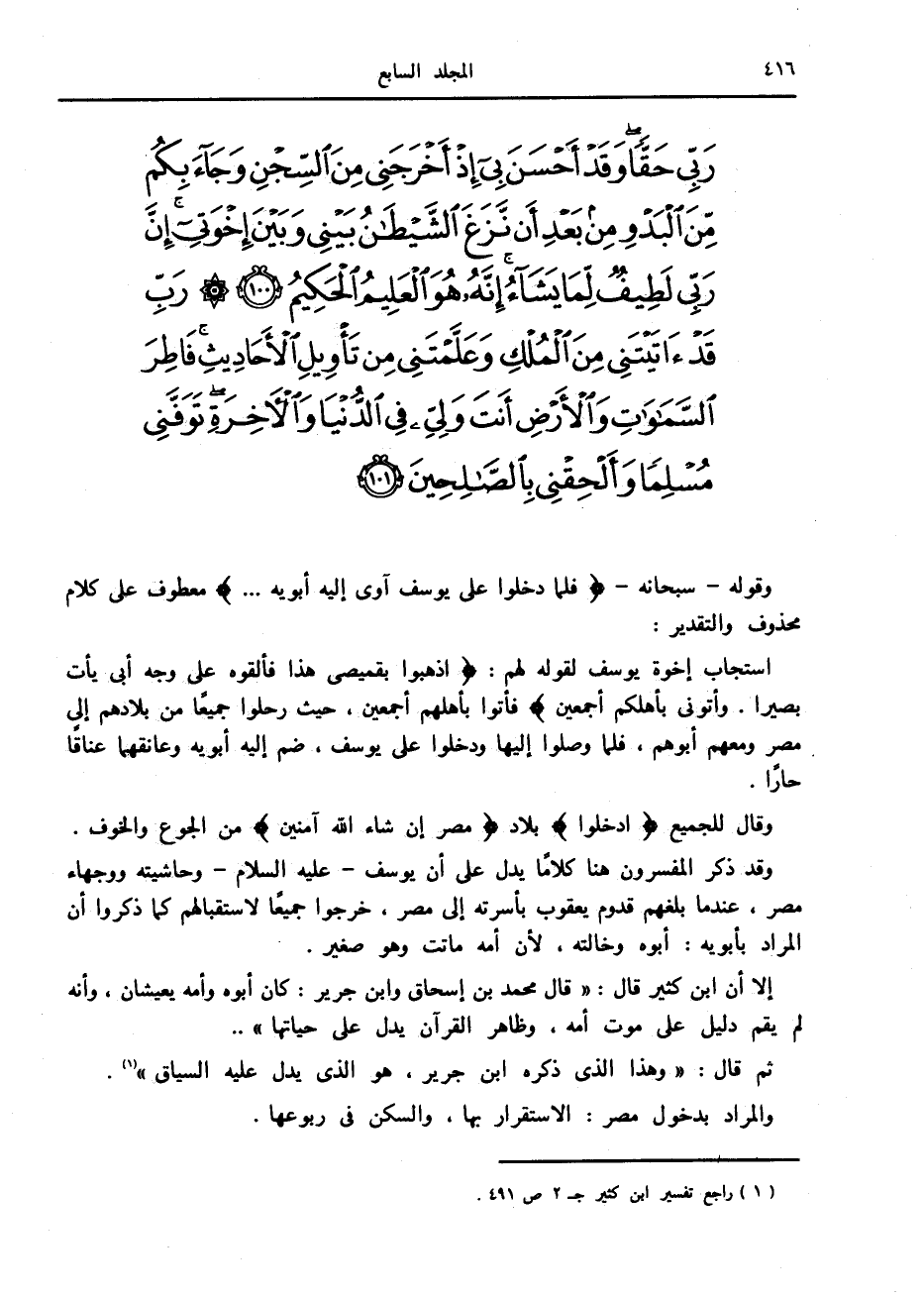 وقد ذكر المفسرون هنا كلاما يدل على أن يوسف- عليه السلام- وحاشيته ووجهاء مصر، عند ما بلغهم قدوم يعقوب بأسرته إلى مصر، خرجوا جميعا لاستقبالهم كما ذكروا أن المراد بأبويه: أبوه وخالته، لأن أمه ماتت وهو صغير.