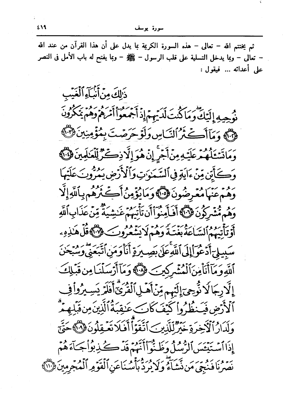 ذلِكَ مِنْ أَنْباءِ الْغَيْبِ نُوحِيهِ إِلَيْكَ وَما كُنْتَ لَدَيْهِمْ إِذْ أَجْمَعُوا أَمْرَهُمْ وَهُمْ يَمْكُرُونَ (102) وَما أَكْثَرُ النَّاسِ وَلَوْ حَرَصْتَ بِمُؤْمِنِينَ (103) وَما تَسْئَلُهُمْ عَلَيْهِ مِنْ أَجْرٍ إِنْ هُوَ إِلاَّ ذِكْرٌ لِلْعالَمِينَ (104) وَكَأَيِّنْ مِنْ آيَةٍ فِي السَّماواتِ وَالْأَرْضِ يَمُرُّونَ عَلَيْها وَهُمْ عَنْها مُعْرِضُونَ (105) وَما يُؤْمِنُ أَكْثَرُهُمْ بِاللَّهِ إِلاَّ وَهُمْ مُشْرِكُونَ (106)