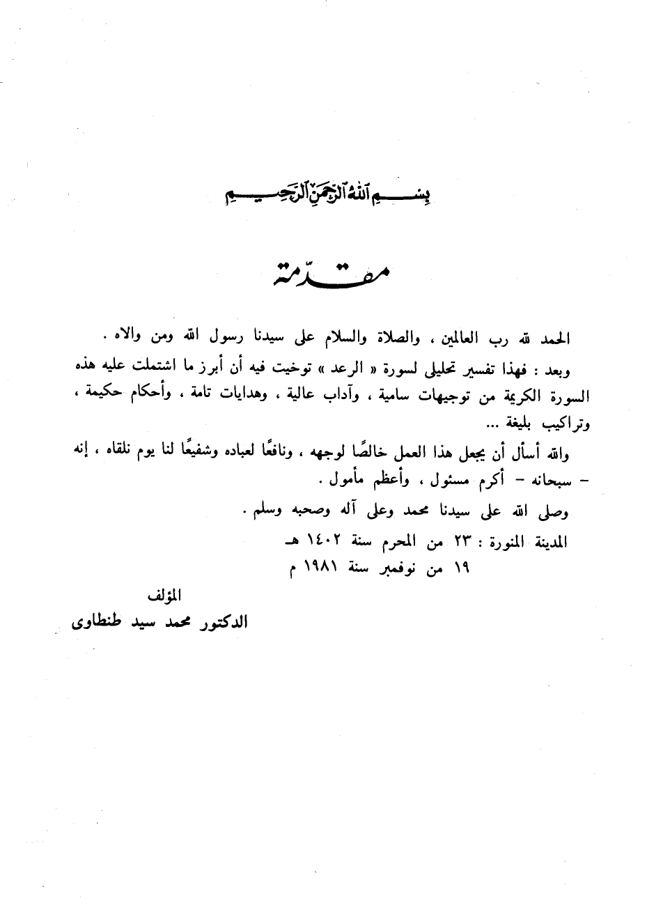 وبعد: فهذا تفسير تحليلي لسورة «الرعد» توخيت فيه أن أبرز ما اشتملت عليه هذه السورة الكريمة من توجيهات سامية، وآداب عالية، وهدايات تامة، وأحكام حكيمة، وتراكيب بليغة ...