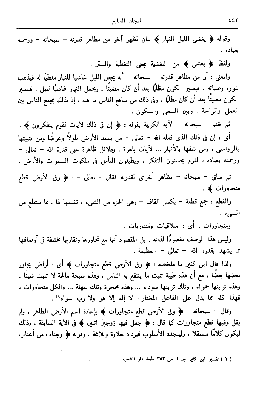 وقال- سبحانه- وَفِي الْأَرْضِ قِطَعٌ مُتَجاوِراتٌ بإعادة اسم الأرض الظاهر، ولم يقل وفيها قطع متجاورات كما قال: جَعَلَ فِيها زَوْجَيْنِ اثْنَيْنِ في الآية السابقة، وذلك ليكون كلاما مستقلا، وليتجدد الأسلوب فيزداد حلاوة وبلاغة. وقوله وَجَنَّاتٌ مِنْ أَعْنابٍ