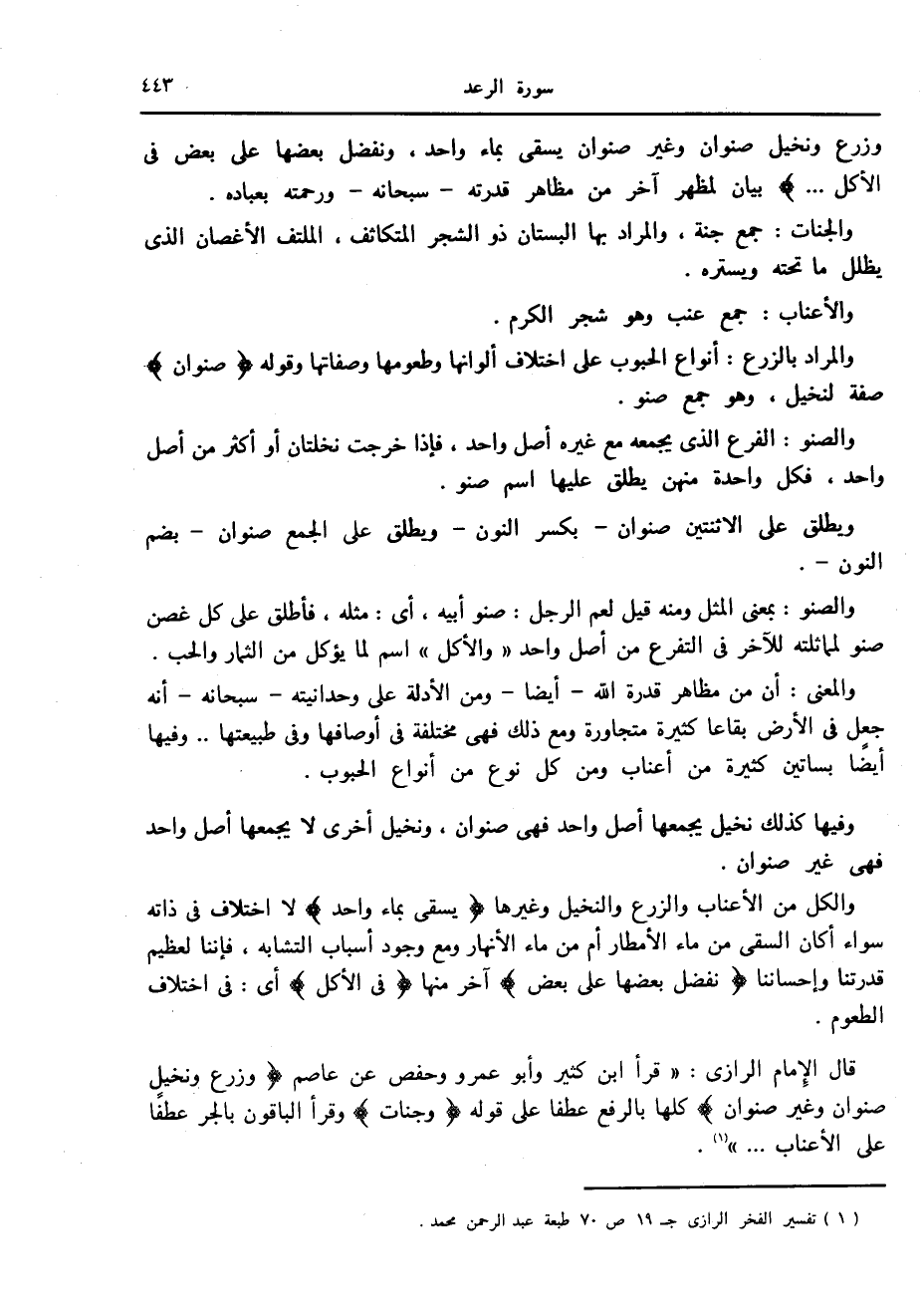 قال الإمام الرازي: «قرأ ابن كثير وأبو عمرو وحفص عن عاصم وَزَرْعٌ وَنَخِيلٌ صِنْوانٌ وَغَيْرُ صِنْوانٍ كلها بالرفع عطفا على قوله وَجَنَّاتٌ وقرأ الباقون بالجر عطفا على الأعناب ... » «1» .