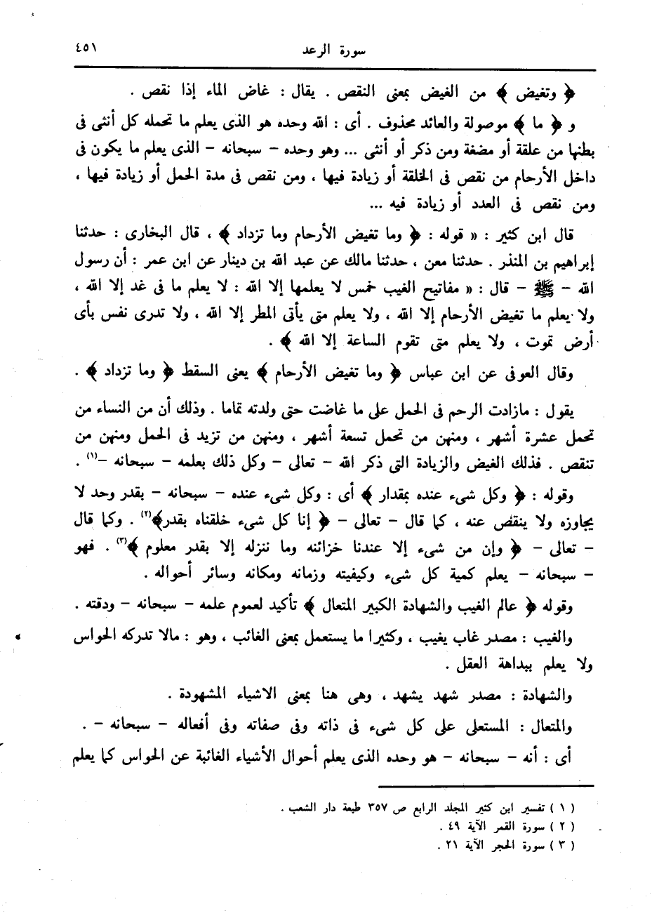 قال ابن كثير: «قوله: وَما تَغِيضُ الْأَرْحامُ وَما تَزْدادُ، قال البخاري: حدثنا إبراهيم بن المنذر. حدثنا معن، حدثنا مالك عن عبد الله بن دينار عن ابن عمر: أن رسول الله صلى الله عليه وسلم قال: «مفاتيح الغيب خمس لا يعلمها إلا الله: لا يعلم ما في غد إلا الله، ولا يعلم ما تغيض الأرحام إلا الله، ولا يعلم متى يأتى المطر إلا الله، ولا تدرى نفس بأى أرض تموت، ولا يعلم متى تقوم الساعة إلا الله» .