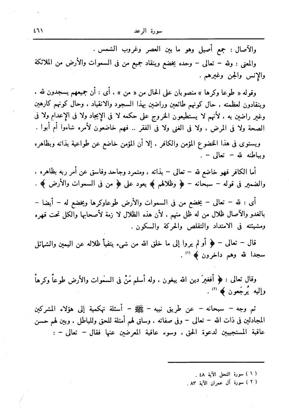 أى: لله- تعالى- يخضع من في السموات والأرض طوعا وكرها ويخضع له- أيضا- بالغدو والآصال ظلال من له ظل منهم، لأن هذه الظلال لازمة لأصحابها والكل تحت قهره ومشيئته في الامتداد والتقلص والحركة والسكون.