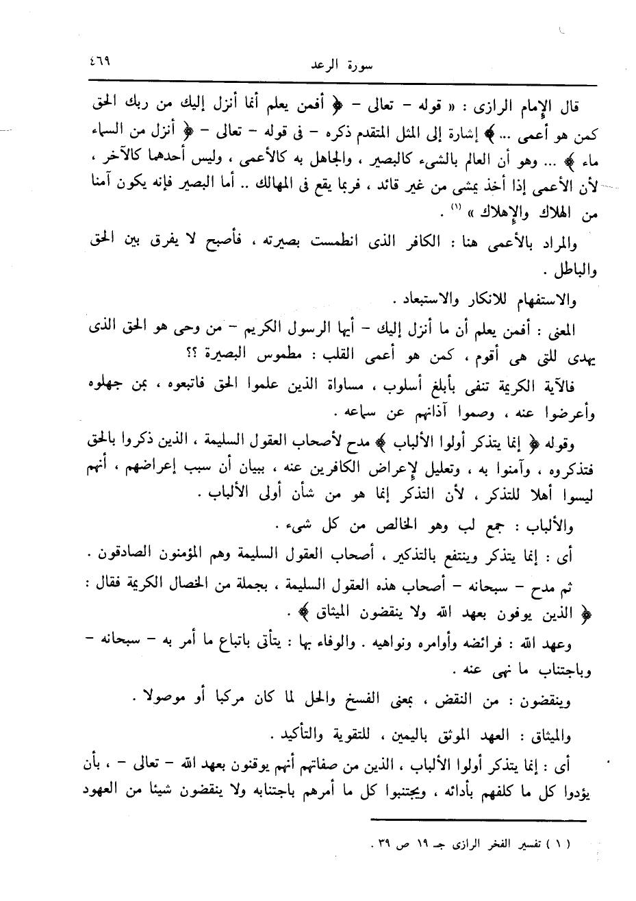 قال الإمام الرازي: «قوله- تعالى- أَفَمَنْ يَعْلَمُ أَنَّما أُنْزِلَ إِلَيْكَ مِنْ رَبِّكَ الْحَقُّ كَمَنْ هُوَ أَعْمى ... إشارة إلى المثل المتقدم ذكره- في قوله- تعالى- أَنْزَلَ مِنَ السَّماءِ ماءً ... وهو أن العالم بالشيء كالبصير، والجاهل به كالأعمى، وليس أحدهما كالآخر، لأن الأعمى إذا أخذ يمشى من غير قائد، فربما يقع في المهالك ... أما البصير فإنه يكون آمنا من الهلاك والإهلاك» «1» .