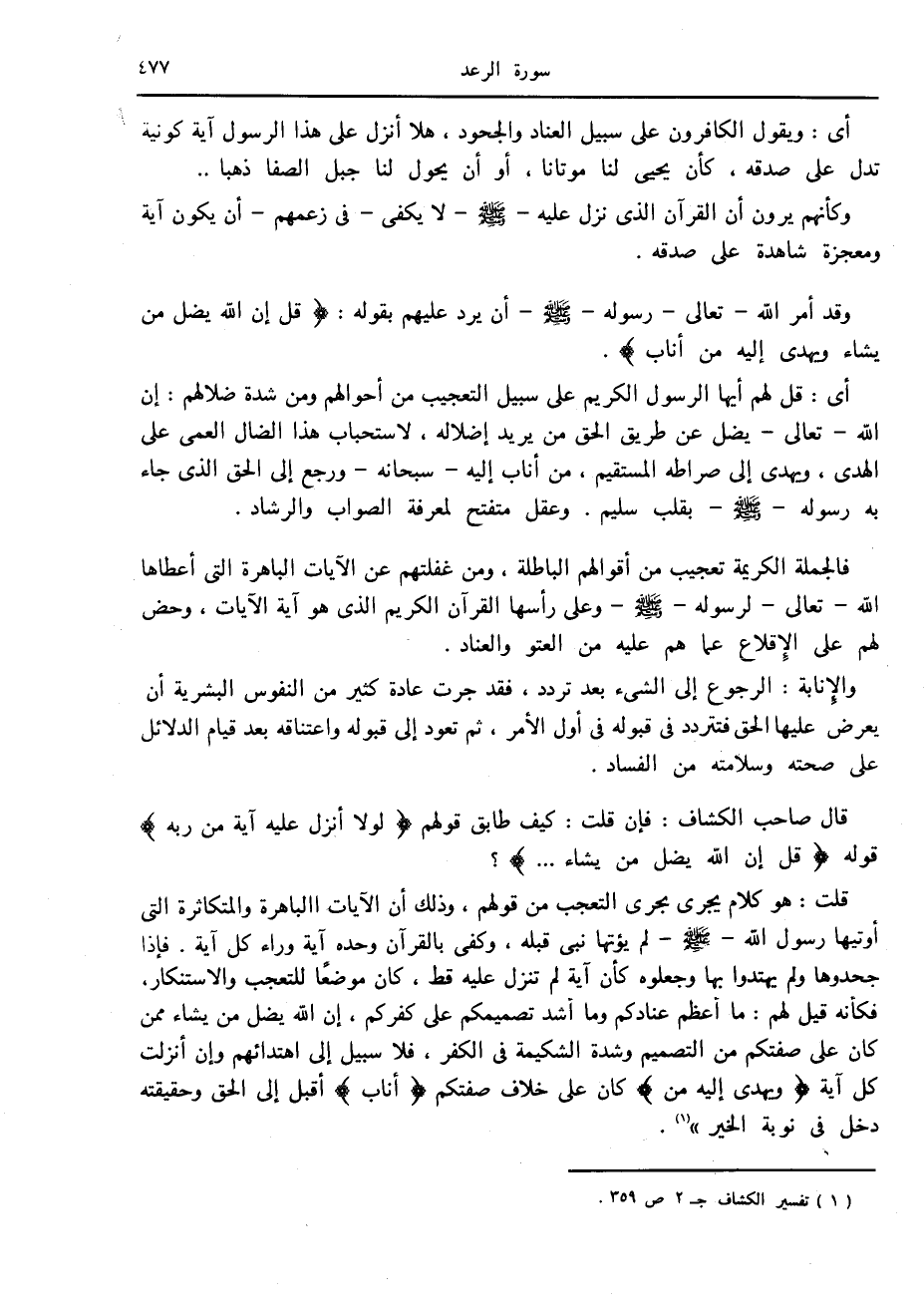 قلت: هو كلام يجرى مجرى التعجب من قولهم، وذلك أن الآيات الباهرة والمتكاثرة التي أوتيها رسول الله صلى الله عليه وسلم لم يؤتها نبي قبله، وكفى بالقرآن وحده آية وراء كل آية. فإذا جحدوها ولم يهتدوا بها وجعلوه كأن آية لم تنزل عليه قط، كان موضعا للتعجب والاستنكار، فكأنه قيل لهم: ما أعظم عنادكم وما أشد تصميمكم على كفركم، إن الله يضل من يشاء ممن كان على صفتكم من التصميم وشدة الشكيمة في الكفر، فلا سبيل إلى اهتدائهم وإن أنزلت كل آية وَيَهْدِي إِلَيْهِ مَنْ كان على خلاف صفتكم أَنابَ أقبل إلى الحق وحقيقته دخل في نوبة الخير» «1» .