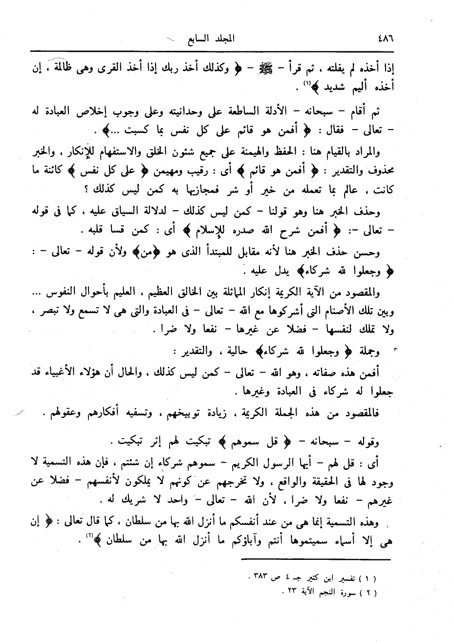 ثم أقام- سبحانه- الأدلة الساطعة على وحدانيته وعلى وجوب إخلاص العبادة له- تعالى- فقال: أَفَمَنْ هُوَ قائِمٌ عَلى كُلِّ نَفْسٍ بِما كَسَبَتْ....