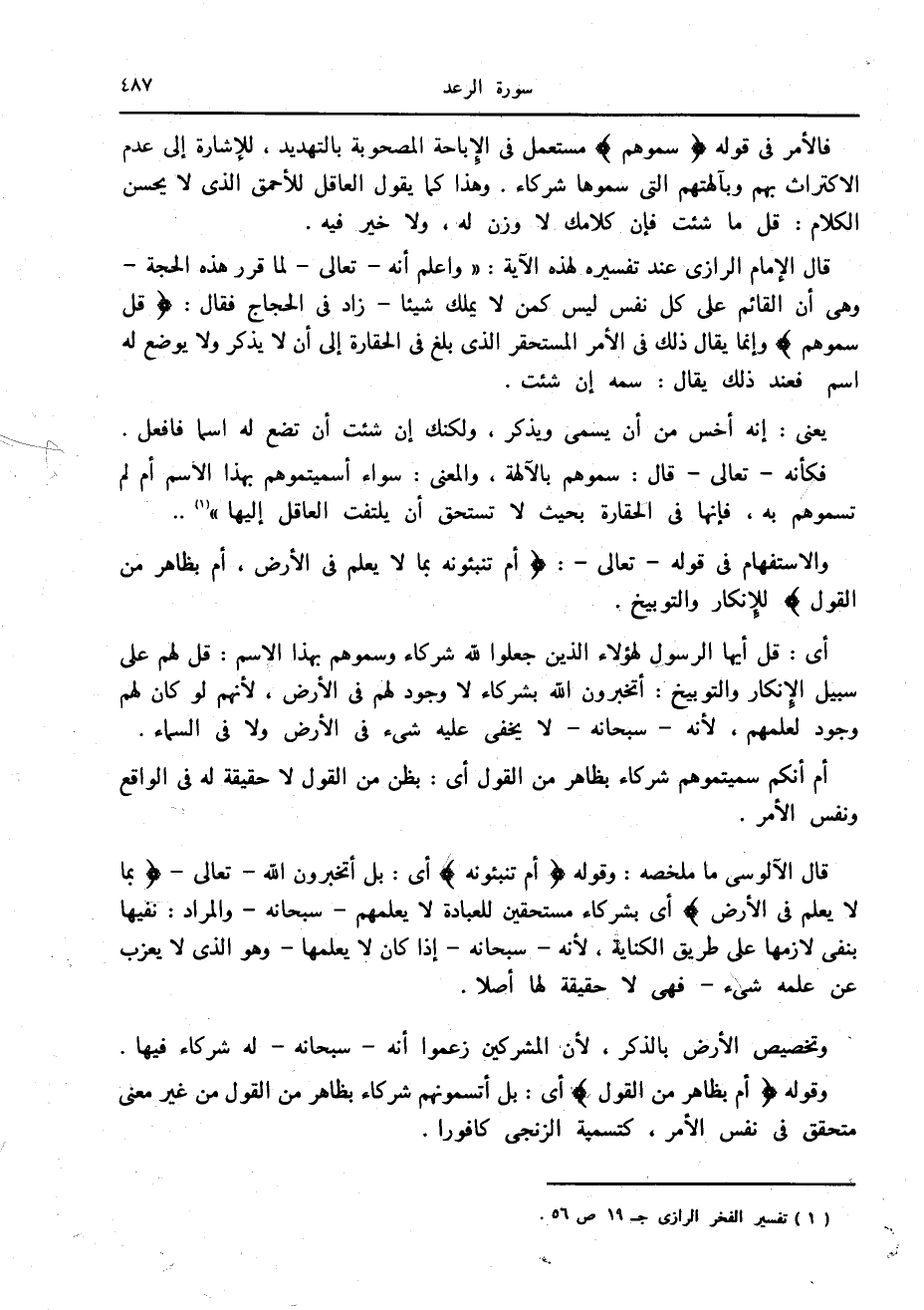 قال الإمام الرازي عند تفسيره لهذه الآية: «واعلم أنه- تعالى- لما قرر هذه الحجة- وهي أن القائم على كل نفس ليس كمن لا يملك شيئا- زاد في الحجاج فقال: قُلْ سَمُّوهُمْ