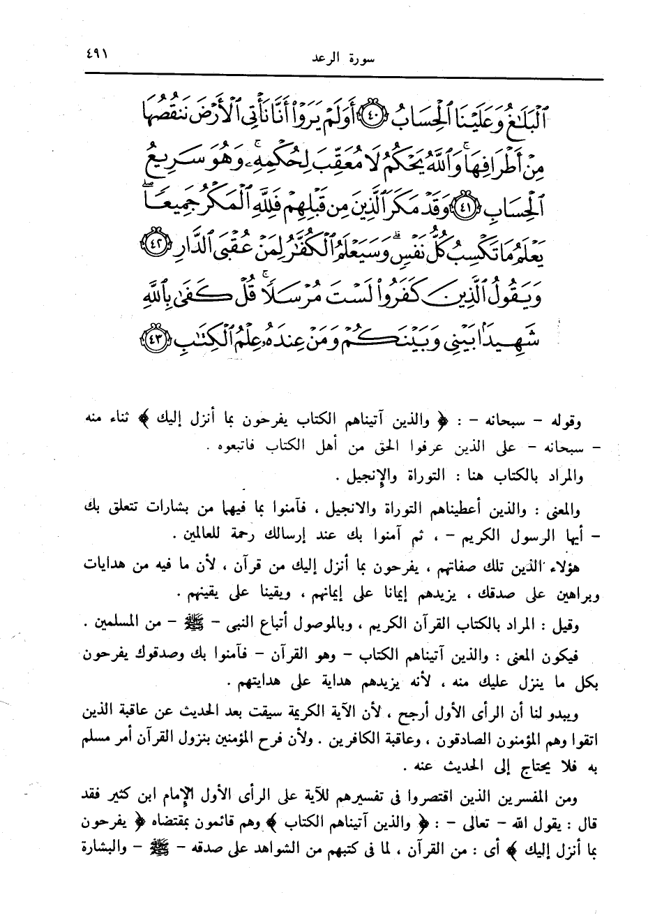 ومن المفسرين الذين اقتصروا في تفسيرهم للآية على الرأى الأول الإمام ابن كثير فقد قال: يقول الله- تعالى-: وَالَّذِينَ آتَيْناهُمُ الْكِتابَ وهم قائمون بمقتضاه يَفْرَحُونَ بِما أُنْزِلَ إِلَيْكَ أى: من القرآن، لما في كتبهم من الشواهد على صدقه صلى الله عليه وسلم والبشارة