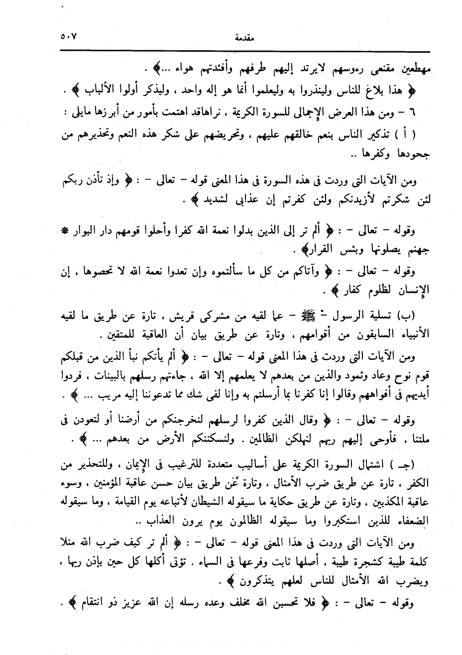 (ج) اشتمال السورة الكريمة على أساليب متعددة للترغيب في الإيمان، وللتحذير من الكفر، تارة عن طريق ضرب الأمثال، وتارة عن طريق بيان حسن عاقبة المؤمنين، وسوء عاقبة المكذبين، وتارة عن طريق حكاية ما يقوله الشيطان لأتباعه يوم القيامة، وما يقوله الضعفاء للذين استكبروا وما يقوله الظالمون يوم يرون العذاب ...