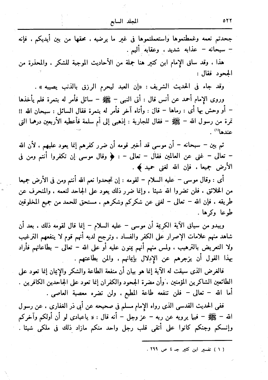 هذا، وقد ساق الإمام ابن كثير هنا جملة من الأحاديث الموجبة للشكر، والمحذرة من الجحود فقال: