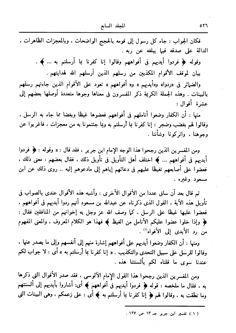 ثم قال بعد أن ساق عددا من الأقوال الأخرى: وأشبه هذه الأقوال عندي بالصواب في تأويل هذه الآية، القول الذي ذكرناه عن عبد الله بن مسعود أنهم ردوا أيديهم في أفواههم، فعضوا عليها غيظا على الرسل، كما وصف الله عز وجل به إخوانهم من المنافقين فقال: