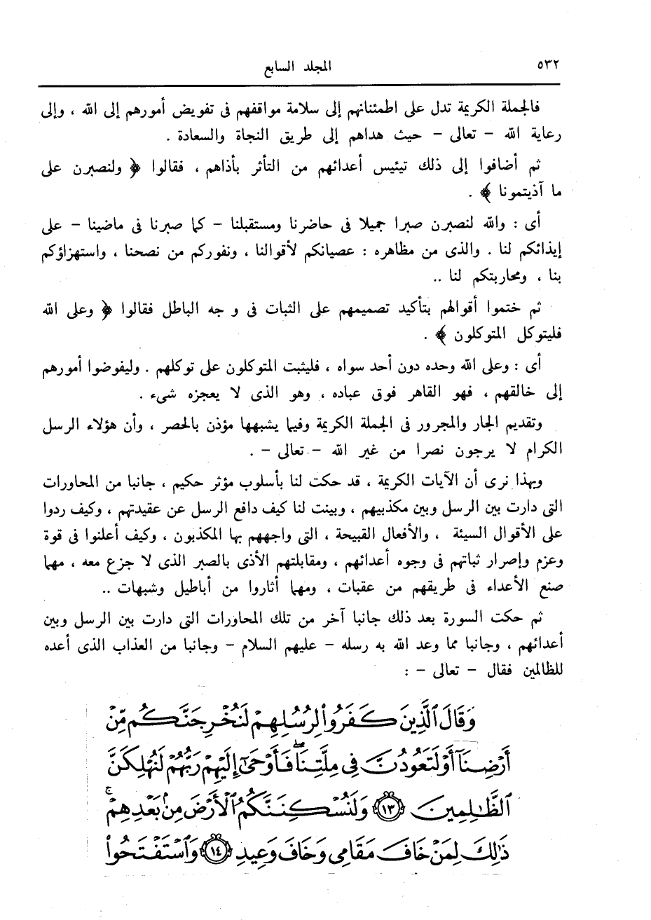 ثم حكت السورة بعد ذلك جانبا آخر من تلك المحاورات التي دارت بين الرسل وبين أعدائهم، وجانبا مما وعد الله به رسله- عليهم السلام- وجانبا من العذاب الذي أعده للظالمين فقال- تعالى-: