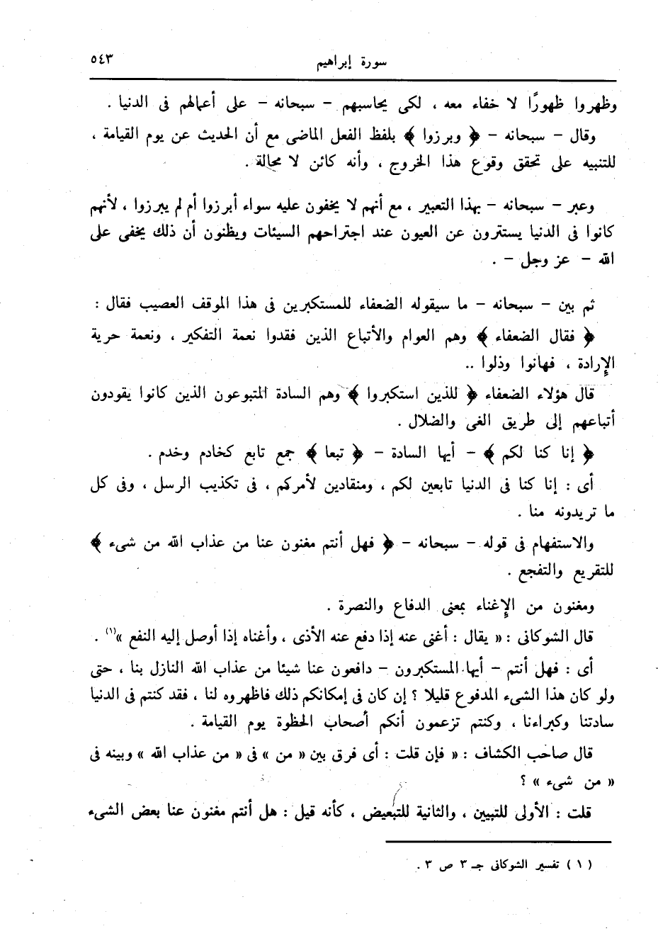 أى: فهل أنتم- أيها المستكبرون- دافعون عنا شيئا من عذاب الله النازل بنا، حتى ولو كان هذا الشيء المدفوع قليلا؟ إن كان في إمكانكم ذلك فأظهروه لنا، فقد كنتم في الدنيا سادتنا وكبراءنا، وكنتم تزعمون أنكم أصحاب الحظوة يوم القيامة.