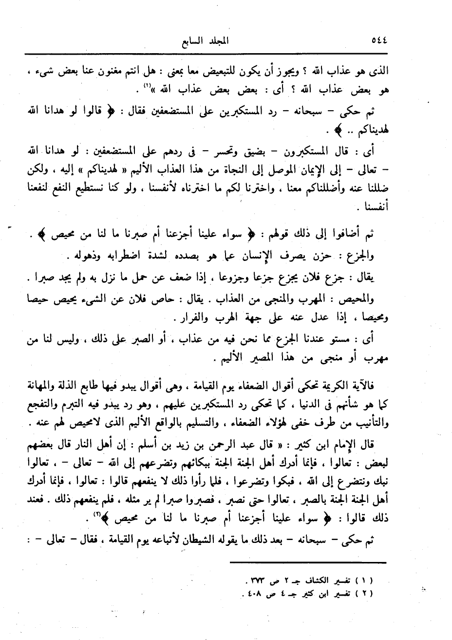 قال الإمام ابن كثير: «قال عبد الرحمن بن زيد بن أسلم: إن أهل النار قال بعضهم لبعض: تعالوا، فإنما أدرك أهل الجنة الجنة ببكائهم وتضرعهم إلى الله- تعالى-، تعالوا نبك ونتضرع إلى الله، فبكوا وتضرعوا، فلما رأوا ذلك لا ينفعهم قالوا: تعالوا، فإنما أدرك أهل الجنة الجنة بالصبر، تعالوا حتى نصبر، فصبروا صبرا لم ير مثله، فلم ينفعهم ذلك. فعند ذلك قالوا: سَواءٌ عَلَيْنا أَجَزِعْنا أَمْ صَبَرْنا ما لَنا مِنْ مَحِيصٍ «2» .