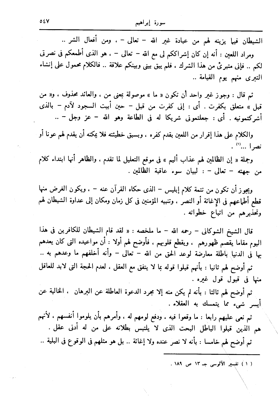 ويجوز أن تكون من تتمة كلام إبليس- الذي حكاه القرآن عنه-، ويكون الغرض منها قطع أطماعهم في الإغاثة أو النصر، وتنبيه المؤمنين في كل زمان ومكان إلى عداوة الشيطان لهم وتحذيرهم من اتباع خطواته.