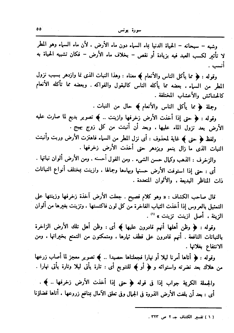وقوله: حَتَّى إِذا أَخَذَتِ الْأَرْضُ زُخْرُفَها وَازَّيَّنَتْ.. تصوير بديع لما صارت عليه الأرض بعد نزول الماء عليها، وبعد أن أنبتت من كل زوج بهيج.