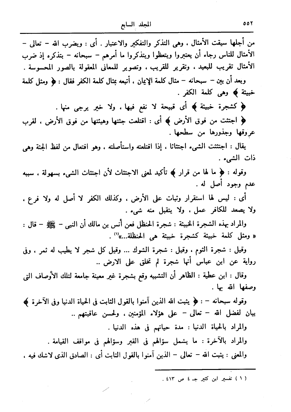 وقوله سبحانه-: يُثَبِّتُ اللَّهُ الَّذِينَ آمَنُوا بِالْقَوْلِ الثَّابِتِ فِي الْحَياةِ الدُّنْيا وَفِي الْآخِرَةِ بيان لفضل الله- تعالى- على هؤلاء المؤمنين، ولحسن عاقبتهم..