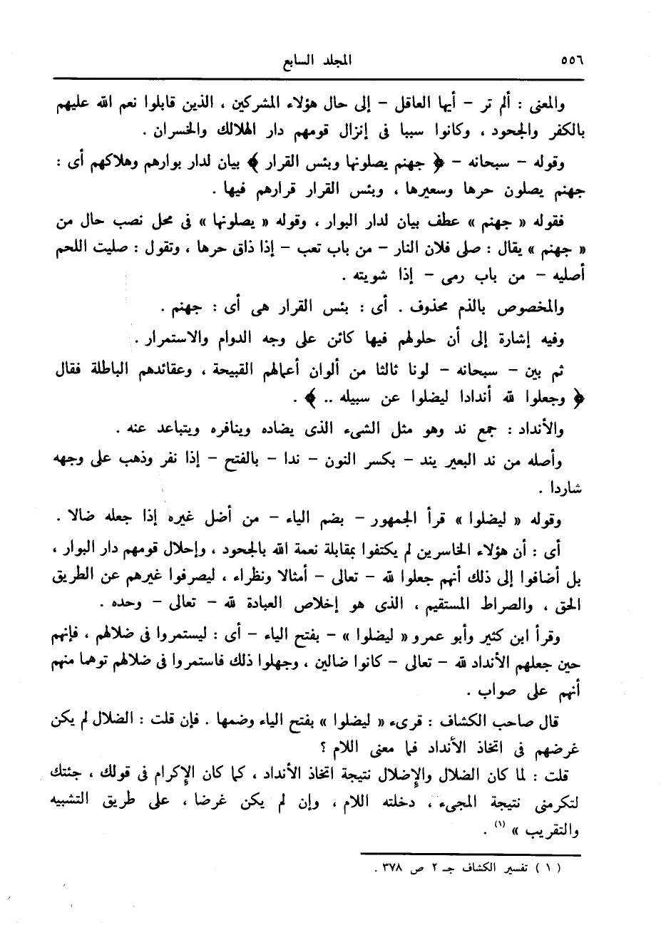 وقرأ ابن كثير وأبو عمرو «ليضلوا» - بفتح الياء- أى: ليستمروا في ضلالهم، فإنهم حين جعلهم الأنداد لله- تعالى- كانوا ضالين، وجهلوا ذلك فاستمروا في ضلالهم توهما منهم أنهم على صواب.