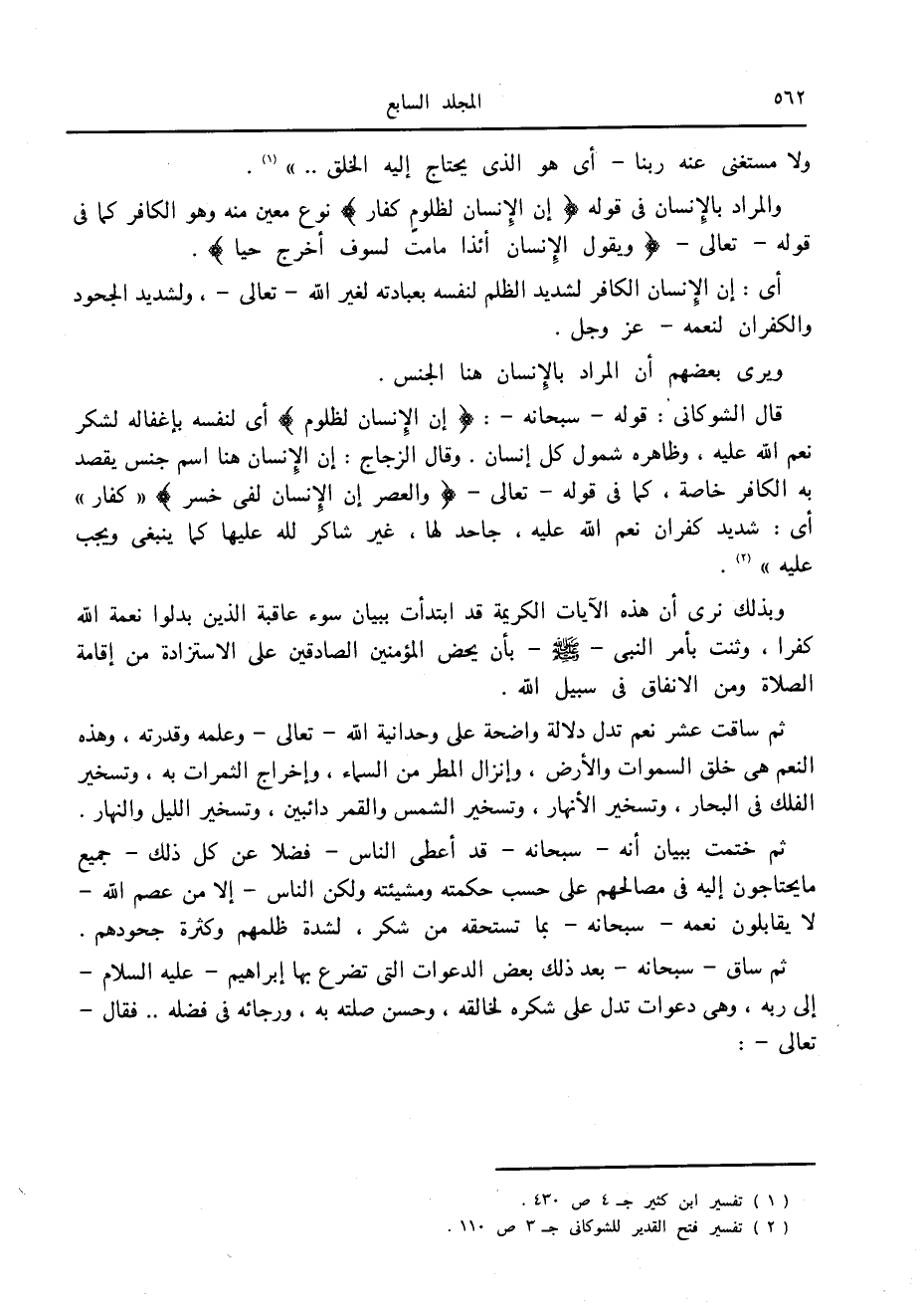 قال الشوكانى: قوله- سبحانه-: إِنَّ الْإِنْسانَ لَظَلُومٌ أى لنفسه بإغفاله لشكر نعم الله عليه، وظاهره شمول كل إنسان. وقال الزجاج: إن الإنسان هنا اسم جنس يقصد به الكافر خاصة، كما في قوله- تعالى- وَالْعَصْرِ إِنَّ الْإِنْسانَ لَفِي خُسْرٍ «كفار» أى: شديد كفران نعم الله عليه، جاحد لها، غير شاكر لله عليها كما ينبغي ويجب عليه» «2» .