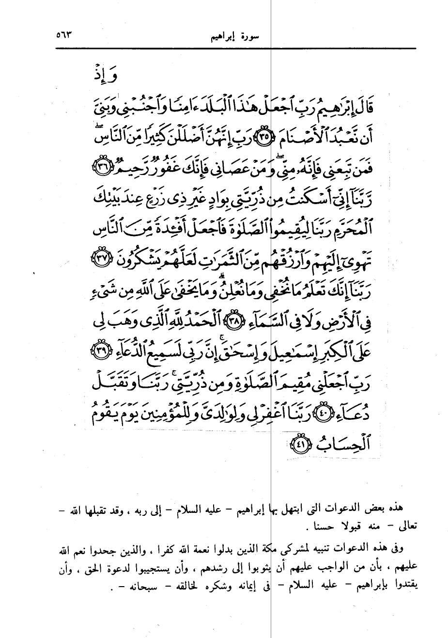 وَإِذْ قالَ إِبْراهِيمُ رَبِّ اجْعَلْ هَذَا الْبَلَدَ آمِناً وَاجْنُبْنِي وَبَنِيَّ أَنْ نَعْبُدَ الْأَصْنامَ (35) رَبِّ إِنَّهُنَّ أَضْلَلْنَ كَثِيراً مِنَ النَّاسِ فَمَنْ تَبِعَنِي فَإِنَّهُ مِنِّي وَمَنْ عَصانِي فَإِنَّكَ غَفُورٌ رَحِيمٌ (36) رَبَّنا إِنِّي أَسْكَنْتُ مِنْ ذُرِّيَّتِي بِوادٍ غَيْرِ ذِي زَرْعٍ عِنْدَ بَيْتِكَ الْمُحَرَّمِ رَبَّنا لِيُقِيمُوا الصَّلاةَ فَاجْعَلْ أَفْئِدَةً مِنَ النَّاسِ تَهْوِي إِلَيْهِمْ وَارْزُقْهُمْ مِنَ الثَّمَراتِ لَعَلَّهُمْ يَشْكُرُونَ (37) رَبَّنا إِنَّكَ تَعْلَمُ ما نُخْفِي وَما نُعْلِنُ وَما يَخْفى عَلَى اللَّهِ مِنْ شَيْءٍ فِي الْأَرْضِ وَلا فِي السَّماءِ (38) الْحَمْدُ لِلَّهِ الَّذِي وَهَبَ لِي عَلَى الْكِبَرِ إِسْماعِيلَ وَإِسْحاقَ إِنَّ رَبِّي لَسَمِيعُ الدُّعاءِ (39)