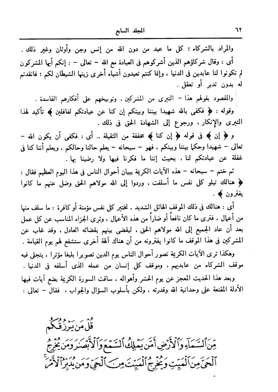وهكذا ترى الآيات الكريمة تصور أحوال الناس يوم الدين تصويرا بليغا مؤثرا، يتجلى فيه موقف الشركاء من عابديهم، وموقف كل إنسان من عمله الذي أسلفه في الدنيا.