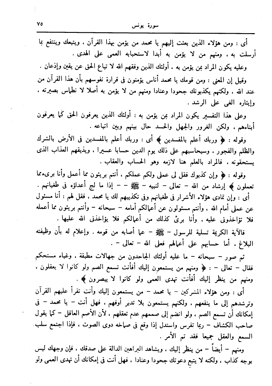 ثم صور- سبحانه- ما عليه أولئك الجاحدون من جهالات مطبقة، وغباء مستحكم فقال- تعالى-: وَمِنْهُمْ مَنْ يَسْتَمِعُونَ إِلَيْكَ أَفَأَنْتَ تُسْمِعُ الصُّمَّ وَلَوْ كانُوا لا يَعْقِلُونَ، وَمِنْهُمْ مَنْ يَنْظُرُ إِلَيْكَ أَفَأَنْتَ تَهْدِي الْعُمْيَ وَلَوْ كانُوا لا يُبْصِرُونَ.