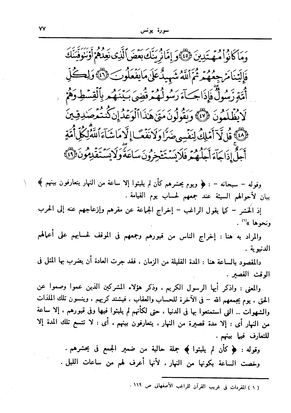 وَيَوْمَ يَحْشُرُهُمْ كَأَنْ لَمْ يَلْبَثُوا إِلاَّ ساعَةً مِنَ النَّهارِ يَتَعارَفُونَ بَيْنَهُمْ قَدْ خَسِرَ الَّذِينَ كَذَّبُوا بِلِقاءِ اللَّهِ وَما كانُوا مُهْتَدِينَ (45) وَإِمَّا نُرِيَنَّكَ بَعْضَ الَّذِي نَعِدُهُمْ أَوْ نَتَوَفَّيَنَّكَ فَإِلَيْنا مَرْجِعُهُمْ ثُمَّ اللَّهُ شَهِيدٌ عَلى ما يَفْعَلُونَ (46) وَلِكُلِّ أُمَّةٍ رَسُولٌ فَإِذا جاءَ رَسُولُهُمْ قُضِيَ بَيْنَهُمْ بِالْقِسْطِ وَهُمْ لا يُظْلَمُونَ (47) وَيَقُولُونَ مَتى هذَا الْوَعْدُ إِنْ كُنْتُمْ صادِقِينَ (48) قُلْ لا أَمْلِكُ لِنَفْسِي ضَرًّا وَلا نَفْعاً إِلاَّ ما شاءَ اللَّهُ لِكُلِّ أُمَّةٍ أَجَلٌ إِذا جاءَ أَجَلُهُمْ فَلا يَسْتَأْخِرُونَ ساعَةً وَلا يَسْتَقْدِمُونَ (49)