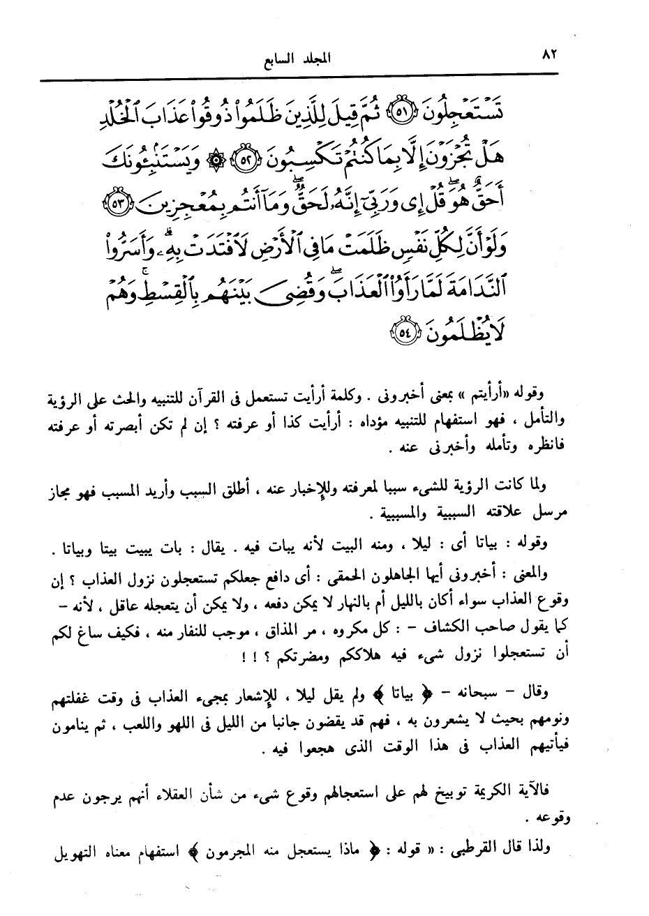 والمعنى: أخبرونى أيها الجاهلون الحمقى: أى دافع جعلكم تستعجلون نزول العذاب؟ إن وقوع العذاب سواء أكان بالليل أم بالنهار لا يمكن دفعه، ولا يمكن أن يتعجله عاقل، لأنه- كما يقول صاحب الكشاف-: كل مكروه، مر المذاق، موجب للنفار منه، فكيف ساغ لكم أن تستعجلوا نزول شيء فيه هلاككم ومضرتكم؟!! وقال- سبحانه- بَياتاً ولم يقل ليلا، للإشعار بمجيء العذاب في وقت غفلتهم ونومهم بحيث لا يشعرون به، فهم قد يقضون جانبا من الليل في اللهو واللعب، ثم ينامون فيأتيهم العذاب في هذا الوقت الذي هجعوا فيه.