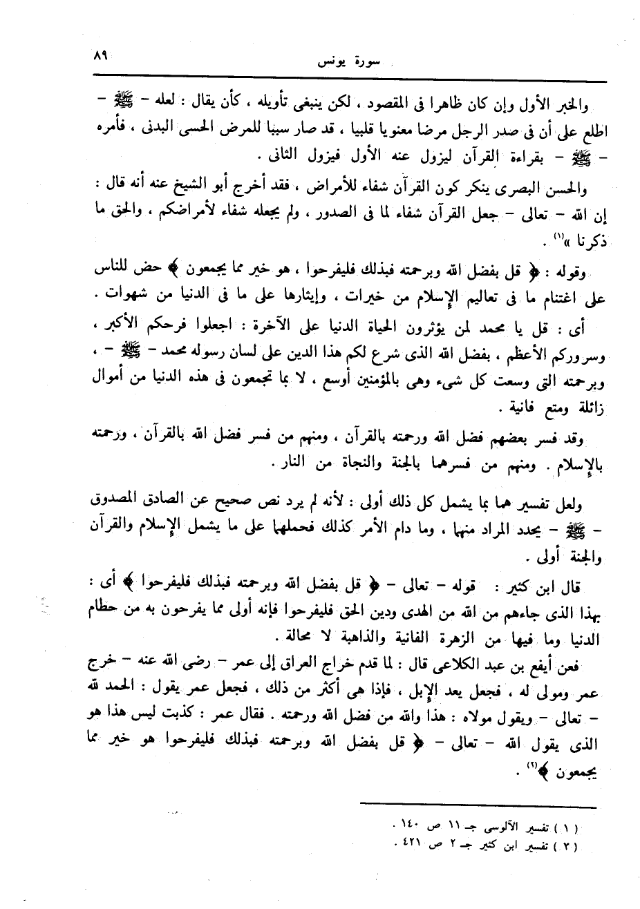 فعن أيفع بن عبد الكلاعى قال: لما قدم خراج العراق إلى عمر- رضى الله عنه- خرج عمر ومولى له، فجعل يعد الإبل، فإذا هي أكثر من ذلك، فجعل عمر يقول: الحمد لله- تعالى- ويقول مولاه: هذا والله من فضل الله ورحمته. فقال عمر: كذبت ليس هذا هو الذي يقول الله- تعالى- قُلْ بِفَضْلِ اللَّهِ وَبِرَحْمَتِهِ فَبِذلِكَ فَلْيَفْرَحُوا هُوَ خَيْرٌ مِمَّا يَجْمَعُونَ «2» .