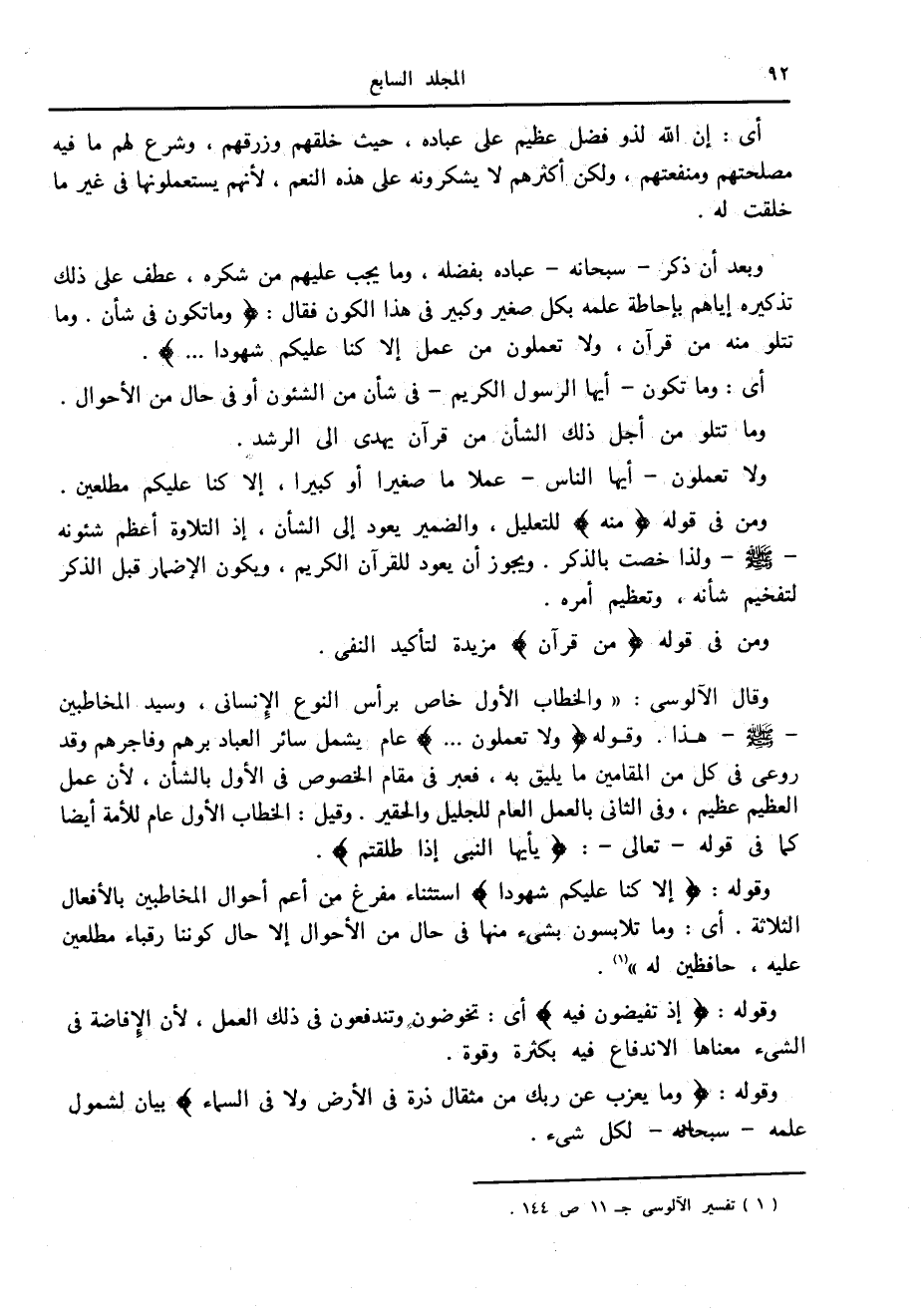 وبعد أن ذكر- سبحانه- عباده بفضله، وما يجب عليهم من شكره، عطف على ذلك تذكيره إياهم بإحاطة علمه بكل صغير وكبير في هذا الكون فقال: وَما تَكُونُ فِي شَأْنٍ. وَما تَتْلُوا مِنْهُ مِنْ قُرْآنٍ، وَلا تَعْمَلُونَ مِنْ عَمَلٍ إِلَّا كُنَّا عَلَيْكُمْ شُهُوداً....