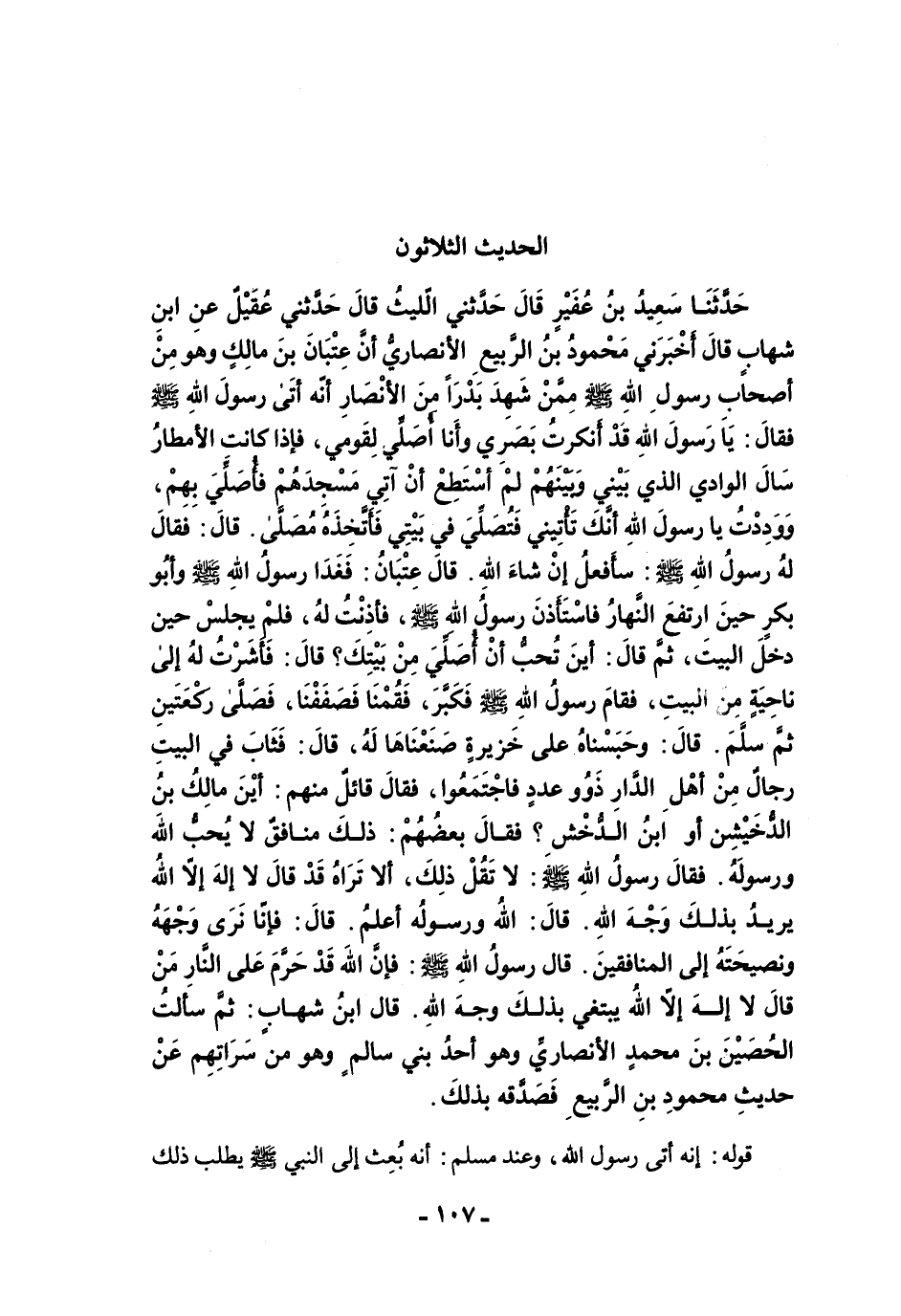 حَدَّثَنَا سَعِيدُ بْنُ عُفَيْرٍ قَالَ حَدَّثَنِي اللَّيْثُ قَالَ حَدَّثَنِي عُقَيْلٌ عَنِ ابْنِ شِهَابٍ قَالَ أَخْبَرَنِي مَحْمُودُ بْنُ الرَّبِيعِ الأَنْصَارِيُّ أَنَّ عِتْبَانَ بْنَ مَالِكٍ وَهُوَ مِنْ أَصْحَابِ رَسُولِ اللَّهِ -صلى الله عليه وسلم- مِمَّنْ شَهِدَ بَدْرًا مِنَ الأَنْصَارِ أَنَّهُ أَتَى رَسُولَ اللَّهِ -صلى الله عليه وسلم- فَقَالَ: يَا رَسُولَ اللَّهِ، قَدْ أَنْكَرْتُ بَصَرِي، وَأَنَا أُصَلِّي لِقَوْمِي، فَإِذَا كَانَتِ الأَمْطَارُ سَالَ الْوَادِى الَّذِى بَيْنِي وَبَيْنَهُمْ، لَمْ أَسْتَطِعْ أَنْ آتِيَ مَسْجِدَهُمْ فَأُصَلِّيَ بِهِمْ، وَوَدِدْتُ يَا رَسُولَ اللَّهِ أَنَّكَ تَأْتِينِي فَتُصَلِّيَ فِي بَيْتِي، فَأَتَّخِذَهُ مُصَلًّى. قَالَ فَقَالَ لَهُ رَسُولُ اللَّهِ -صلى الله عليه وسلم-: سَأَفْعَلُ إِنْ شَاءَ اللَّهُ. قَالَ عِتْبَانُ: فَغَدَا رَسُولُ اللَّهِ -صلى الله عليه وسلم- وَأَبُو بَكْرٍ حِينَ ارْتَفَعَ النَّهَارُ، فَاسْتَأْذَنَ رَسُولُ اللَّهِ -صلى الله عليه وسلم- فَأَذِنْتُ لَهُ، فَلَمْ يَجْلِسْ حَين دَخَلَ الْبَيْتَ، ثُمَّ قَالَ: "أَيْنَ تُحِبُّ أَنْ أُصَلِّيَ مِنْ بَيْتِكَ؟. قَالَ فَأَشَرْتُ لَهُ إِلَى نَاحِيَةٍ مِنَ الْبَيْتِ، فَقَامَ رَسُولُ اللَّهِ -صلى الله عليه وسلم- فَكَبَّرَ، فَقُمْنَا فَصَفَّنَا، فَصَلَّى رَكْعَتَيْنِ ثُمَّ سَلَّمَ، قَالَ: وَحَبَسْنَاهُ عَلَى خَزِيرَةٍ صَنَعْنَاهَا لَهُ. قَالَ: فَثَابَ فِي الْبَيْتِ رِجَالٌ مِنْ أَهْلِ الدَّارِ ذَوُو عَدَدٍ فَاجْتَمَعُوا، فَقَالَ قَائِلٌ مِنْهُمْ: أَيْنَ مَالِكُ بْنُ الدُّخَيْشِنِ أَوِ ابْنُ الدُّخْشُنِ؟ فَقَالَ بَعْضُهُمْ: ذَلِكَ مُنَافِقٌ لاَ يُحِبُّ اللَّهَ وَرَسُولَهُ. فَقَالَ رَسُولُ اللَّهِ -صلى الله عليه وسلم-: لاَ تَقُلْ ذَلِكَ، أَلاَ تَرَاهُ قَدْ قَالَ لاَ إِلَهَ إِلاَّ اللَّهُ. يُرِيدُ بِذَلِكَ وَجْهَ اللَّهِ. قَالَ: اللَّهُ وَرَسُولُهُ أَعْلَمُ. قَالَ فَإِنَّا نَرَى وَجْهَهُ وَنَصِيحَتَهُ إِلَى الْمُنَافِقِينَ. قَالَ رَسُولُ اللَّهِ -صلى الله عليه وسلم-: فَإِنَّ اللَّهَ قَدْ حَرَّمَ عَلَى النَّارِ مَنْ قَالَ لاَ إِلَهَ إِلاَّ اللَّهُ. يَبْتَغِي بِذَلِكَ وَجْهَ اللَّهِ. قَالَ ابْنُ شِهَابٍ ثُمَّ سَأَلْتُ الْحُصَيْنَ بْنَ مُحَمَّدٍ الأَنْصَارِيَّ وَهْوَ أَحَدُ بَنِي سَالِمٍ وَهُوَ مِنْ سَرَاتِهِمْ عَنْ حَدِيثِ مَحْمُودِ بْنِ الرَّبِيعِ، فَصَدَّقَهُ بِذَلِكَ.