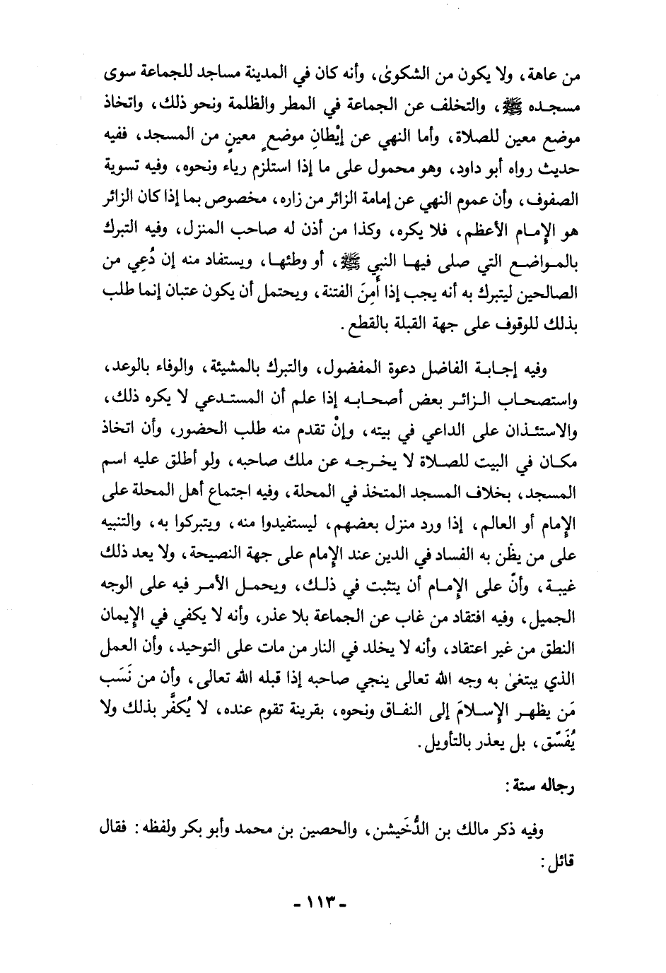 وفيه إجابة الفاضل دعوة المفضول، والتبرك بالمشيئة، والوفاء بالوعد، واستصحاب الزائر بعض أصحابه إذا علم أن المستدعي لا يكره ذلك، والاستئذان على الداعي في بيته، وإنْ تقدم منه طلب الحضور، وأن اتخاذ مكان في البيت للصلاة لا يخرجه عن ملك صاحبه، ولو أطلق عليه اسم المسجد، بخلاف المسجد المتخذ في المحلة، وفيه اجتماع أهل المحلة على الإِمام أو العالم، إذا ورد منزل بعضهم، ليستفيدوا منه، ويتبركوا به، والتنبيه على من يظن به الفساد في الدين عند الإِمام على جهة النصيحة، ولا يعد ذلك غيبة، وأنّ على الإِمام أن يتثبت في ذلك، ويحمل الأمر فيه على الوجه الجميل، وفيه افتقاد من غاب عن الجماعة بلا عذر، وأنه لا يكفي في الإيمان النطق من غير اعتقاد، وأنه لا يخلد في النار من مات على التوحيد، وأن العمل الذي يبتغى به وجه الله تعالى ينجي صاحبه إذا قبله الله تعالى، وأن من نَسَب مَن يظهر الإِسلامَ إلى النفاق ونحوه، بقرينة تقوم عنده، لا يُكفَّر بذلك ولا يُفَسّق، بل يعذر بالتأويل.