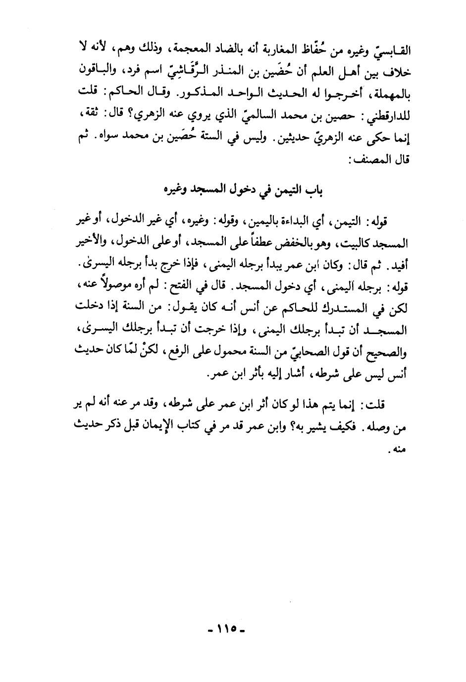 القابسيّ وغيره من حُفّاظ المغاربة أنه بالضاد المعجمة، وذلك وهم, لأنه لا خلاف بين أهل العلم أن حُضَين بن المنذر الرَّقَاشِيّ اسم فرد، والباقون بالمهملة، أخرجوا له الحديث الواحد المذكور. وقال الحاكم: قلت للدارقطني: حصين بن محمد السالميّ الذي يروي عنه الزهري؟ قال: ثقة، إنما حكى عنه الزهريّ حديثين. وليس في الستة حُصَين بن محمد سواه. ثم قال المصنف: